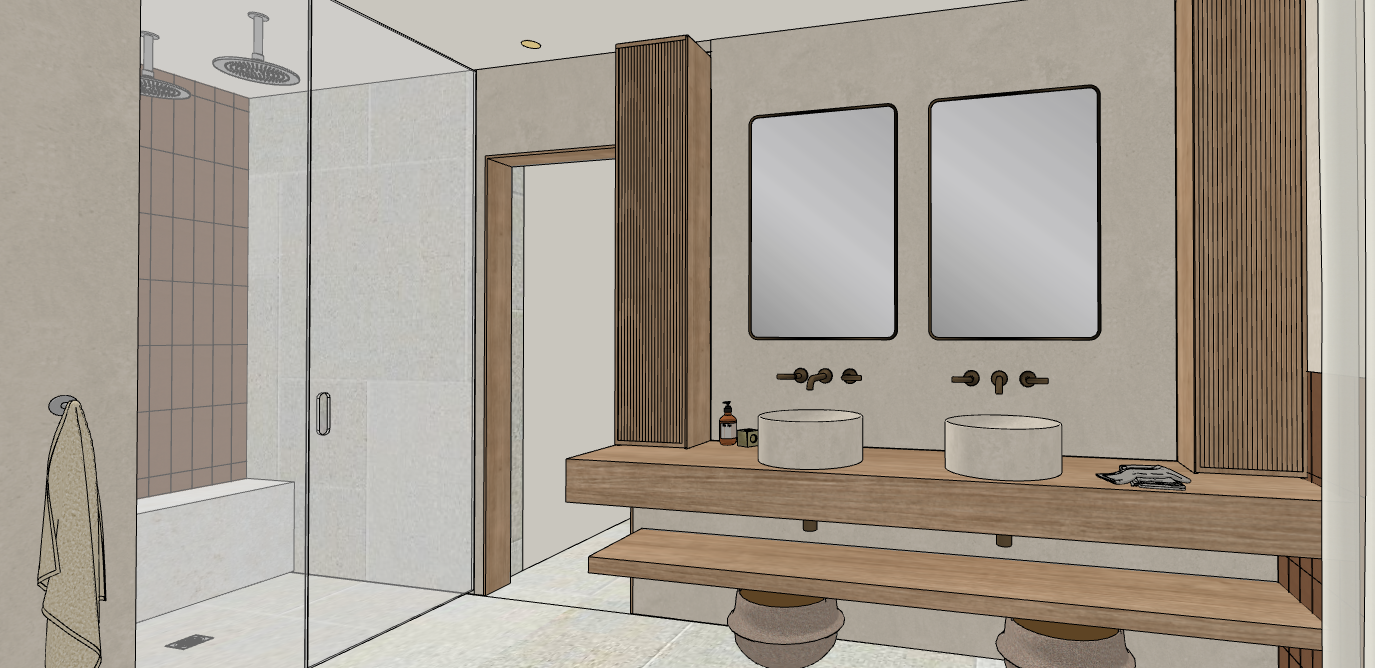 organic and luminous bathroom with stone tile floors in light beige light oak vanity and light oak reeded pannel doors little more moody ambiance