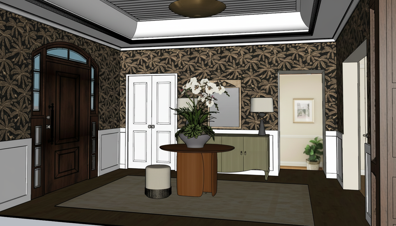 use the unfinished image as the base preserve the exact camera angle perspective framing and all structural elements do not add remove or modify any doors opening windows or walls install the kitchen only on the left wall with the window do not generate any cabinetry counters or features on the left wall or back wall do not create new doorways or openings all cabinets must be flush against the right wall and follow its exact length and perspective keep the rest of the room empty apply only the style from the reference image lighter cabinets white countertops warm lighting without altering layout