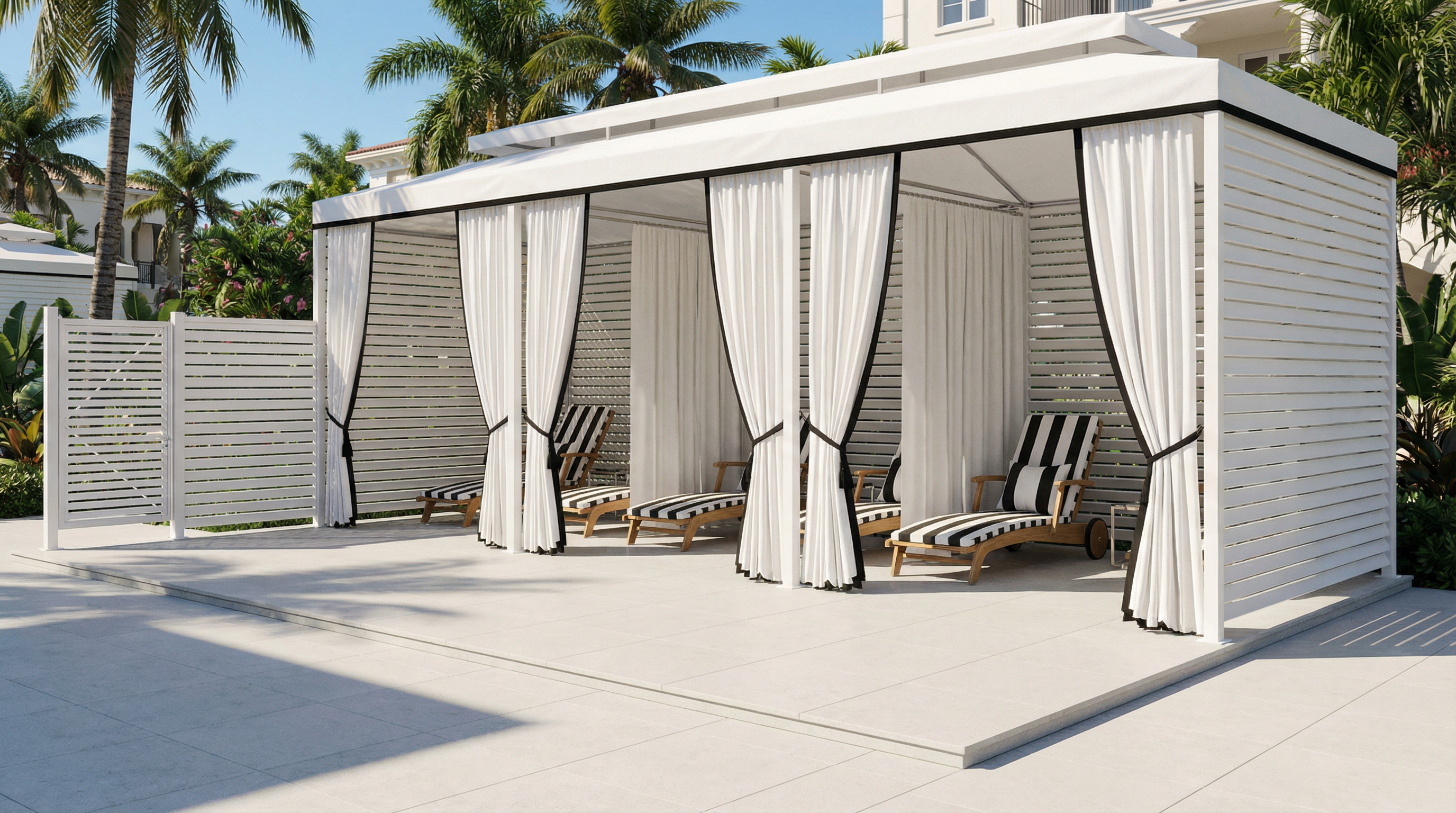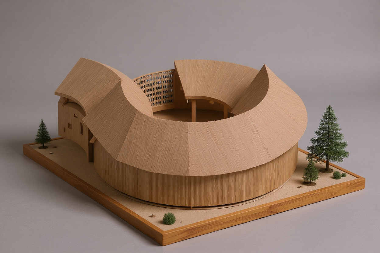 grey vertical siding in sunlight snow and medium pine trees in the foreground and large pine trees behind the house black posts and railing