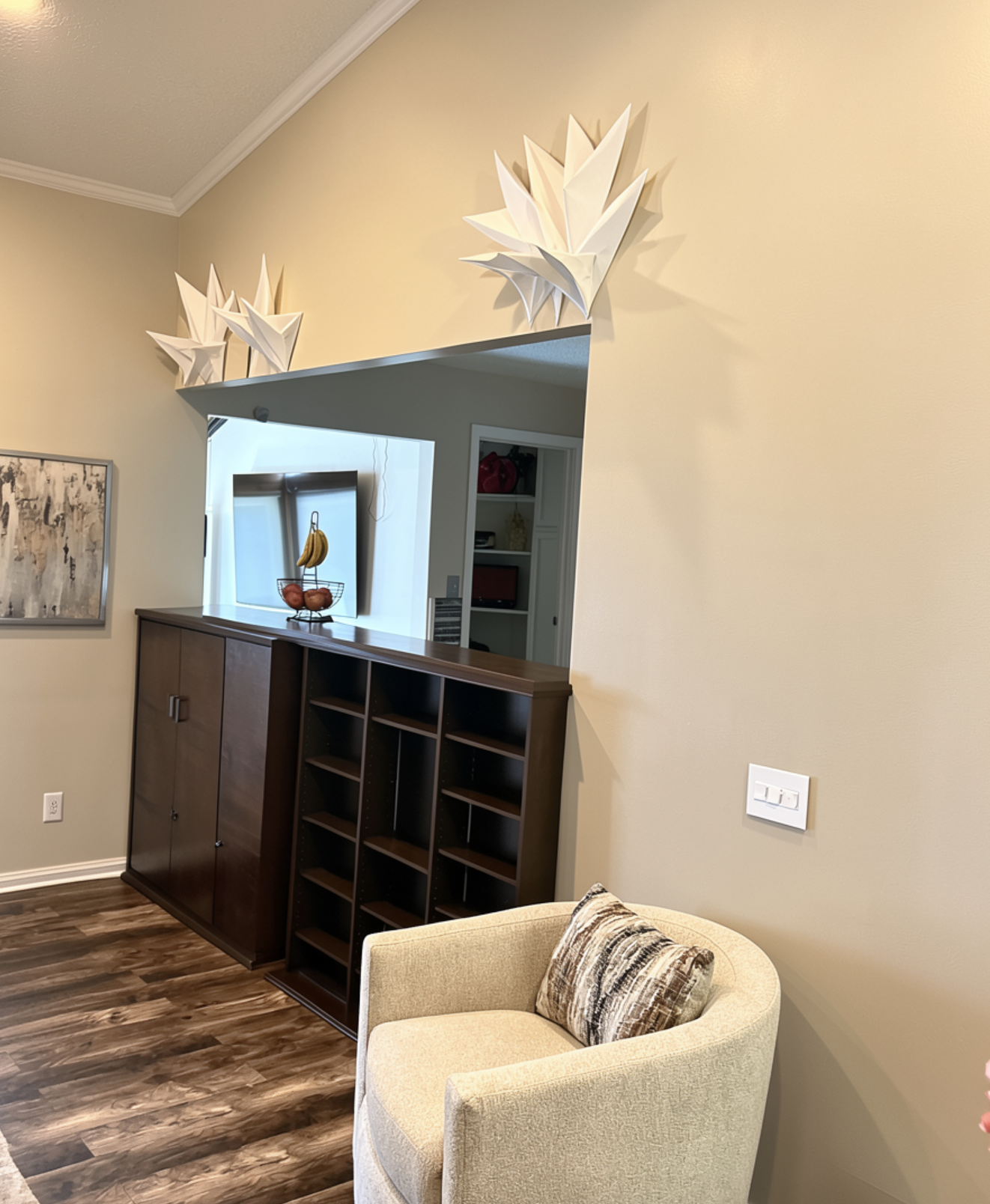remove shelves above tv and remove cabinet under tv add tv console table