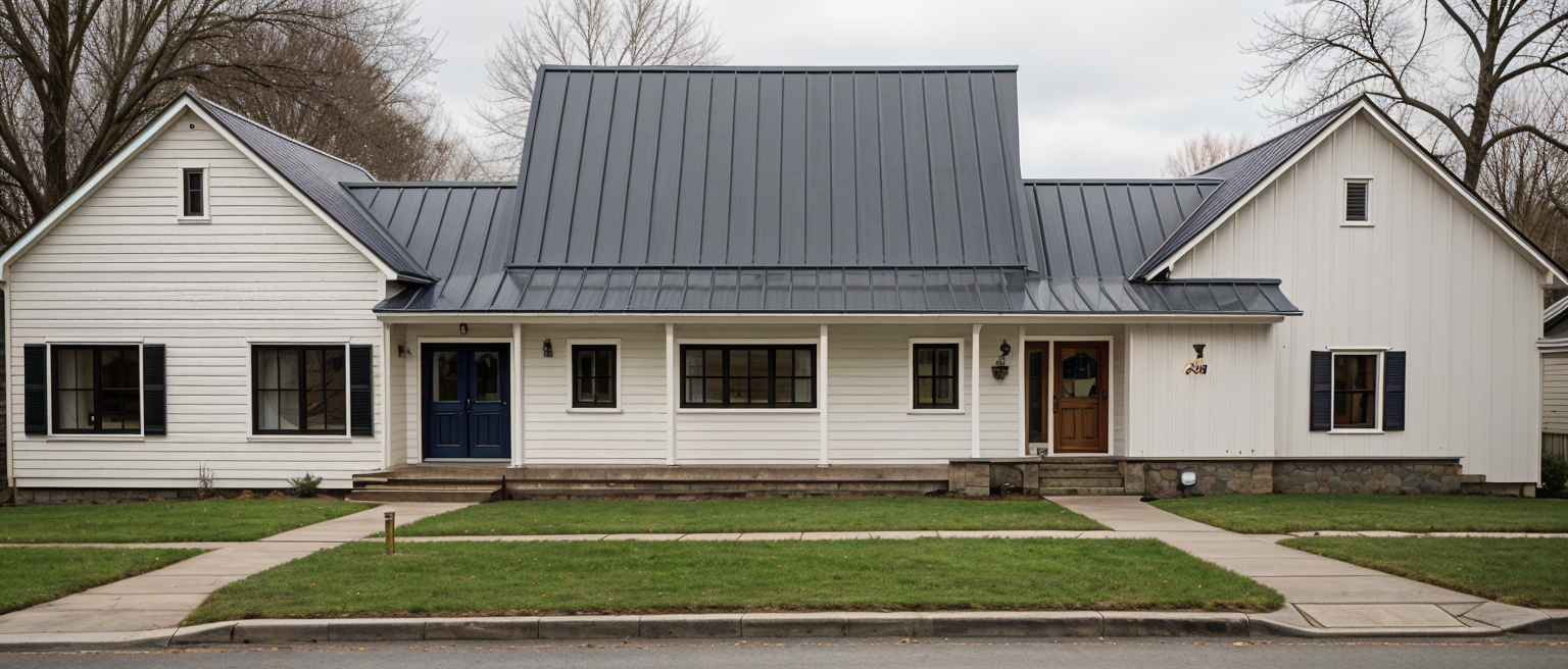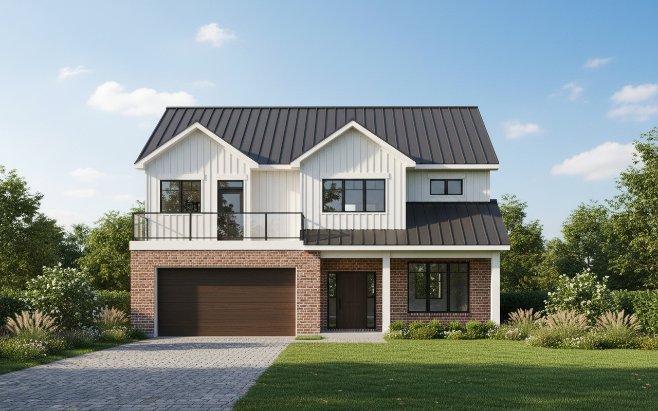 red brick black doors living room inside lighton trees in background and bushes in foreground more bushes