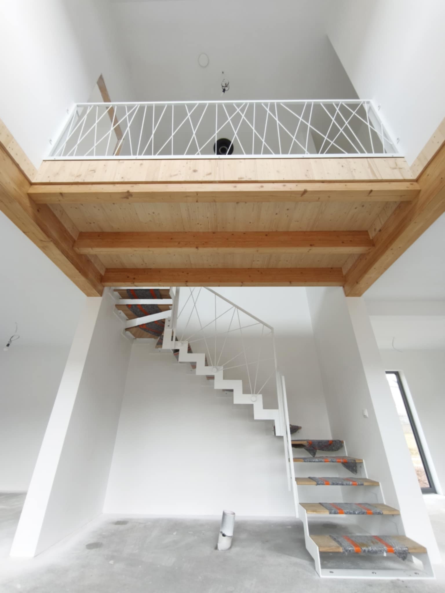transform an unfinished raw construction interior into a refined contemporary residential space preserve the original staircase geometry railing and all existing wooden structural elements strictly without alteration place a modern freestanding wood burning stove centrally within the staircase void inspired by scandinavian design similar to j tul with a slim black steel chimney rising vertically through the middle of the staircase space up to the ceiling remove all temporary protective fabrics from the stair treads add modern suspended pendant lighting with clean lines and warm ambient light enhancing verticality and spatial depth under the staircase create an intimate lounge corner a contemporary lounge armchair subtle indirect lighting and a built in minimalist bookshelf forming a cozy reading nook floor finish seamless poured epoxy resin flooring in a soft beige grey tone matte or satin finish overall atmosphere fresh modern original elegant yet warm clearly reflecting a timber frame family house lighting should be natural and balanced combining daylight with warm artificial light producing a representative high end architectural render style references contemporary scandinavian architecture modern alpine interior restrained material palette calm and timeless design high realism architectural visualization quality natural materials soft shadows clean composition