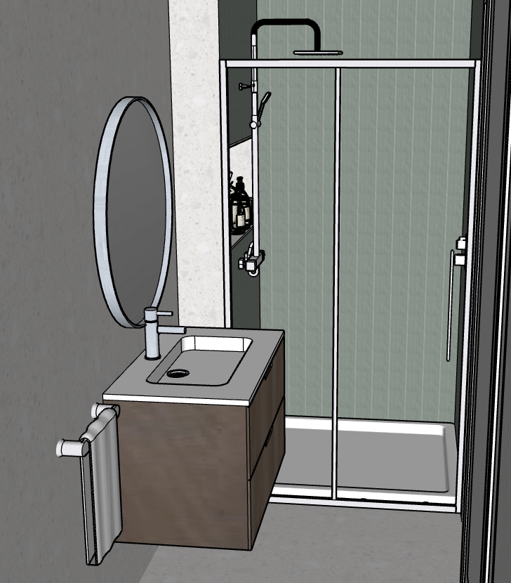 led mirror above the vanity with led lights in the niche in the shower flush ceiling spotlights above shower