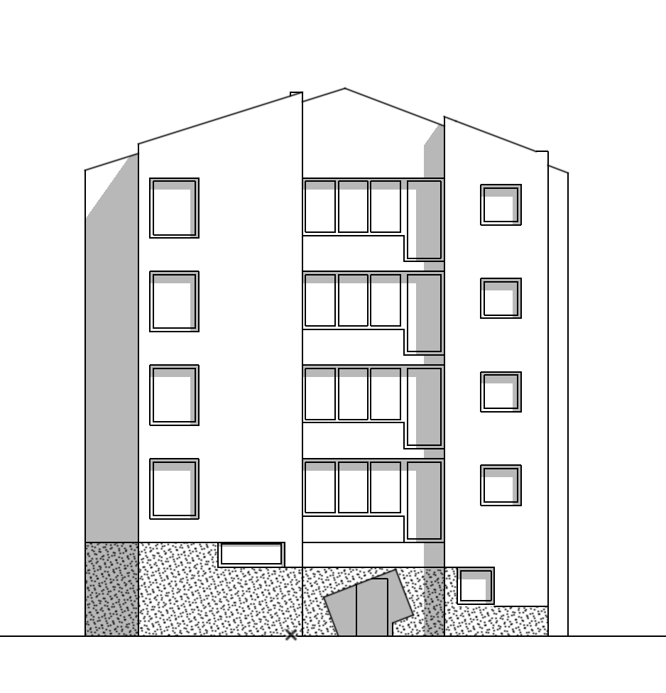 rough white plaster facade ending in rough concrete in the bottom part windows with wood frames building stands in a swiss alpine village in the engadin region