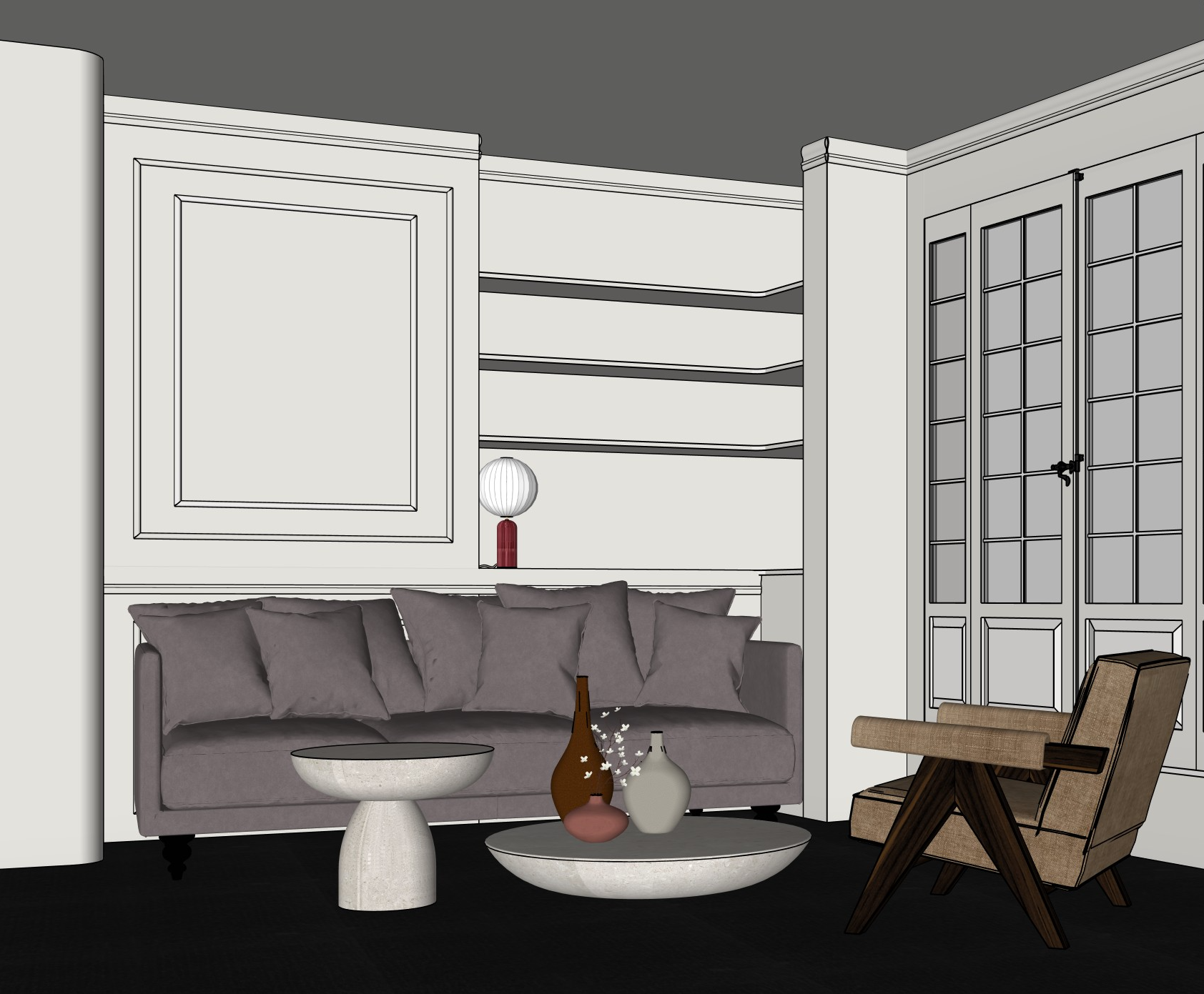 the walls are in light beige the frame of the window is the same color as the walls the espagnolette bolt is in dark bronze the floor is in black wood the sofa is in grey mustard like this sofa https www laredoute fr ppdp prod 500807014 aspx searchkeyword lazare shoppingtool search the armchair is the easy armchair by pierre jeanneret in taupe velvet the coffee tables should be in dark wood put ancient books on the shelves the living room is on the 6th floor of a parisian building