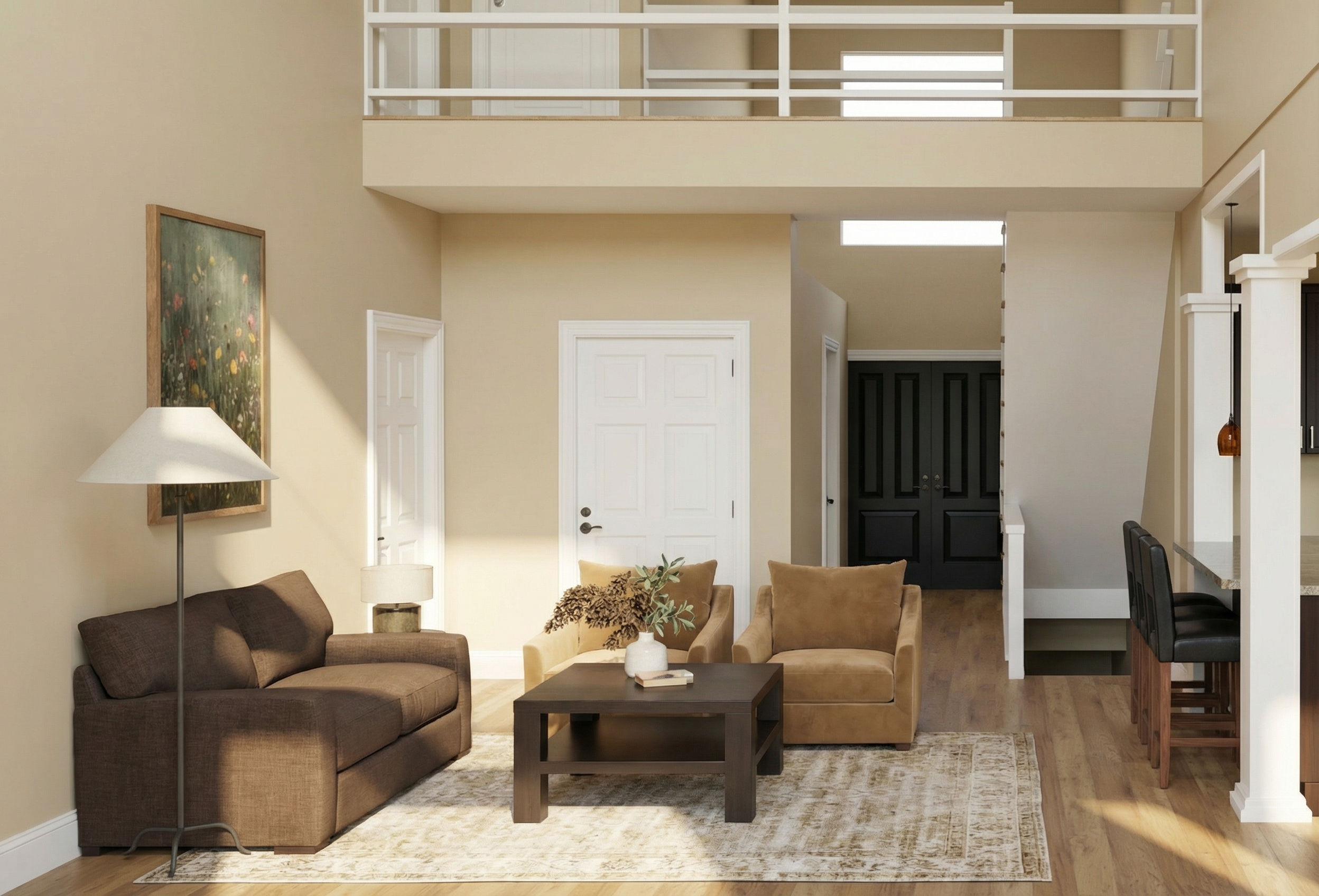 the doors and trim are white the floor is a natural oak hardwood the chairs are a camel velvet color the sofa is a pinecone color the bar stools right in front are black leather the walls are a wheat beige color the rug is a beige and subtle gold and taupe distressed rug the outside environment is a large deck with a bay and woods in the background add a single throw pillow on the sofa add a small palm plant by the floor lamp make the shade on the floor lamp a chocolate brown color