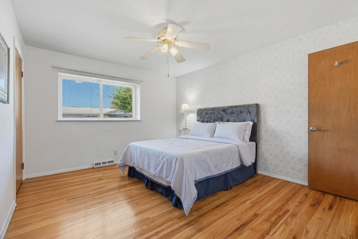 make a render for this bathroom the counter top is white corian and the cupboard is natural oak wood all metals are guned metal