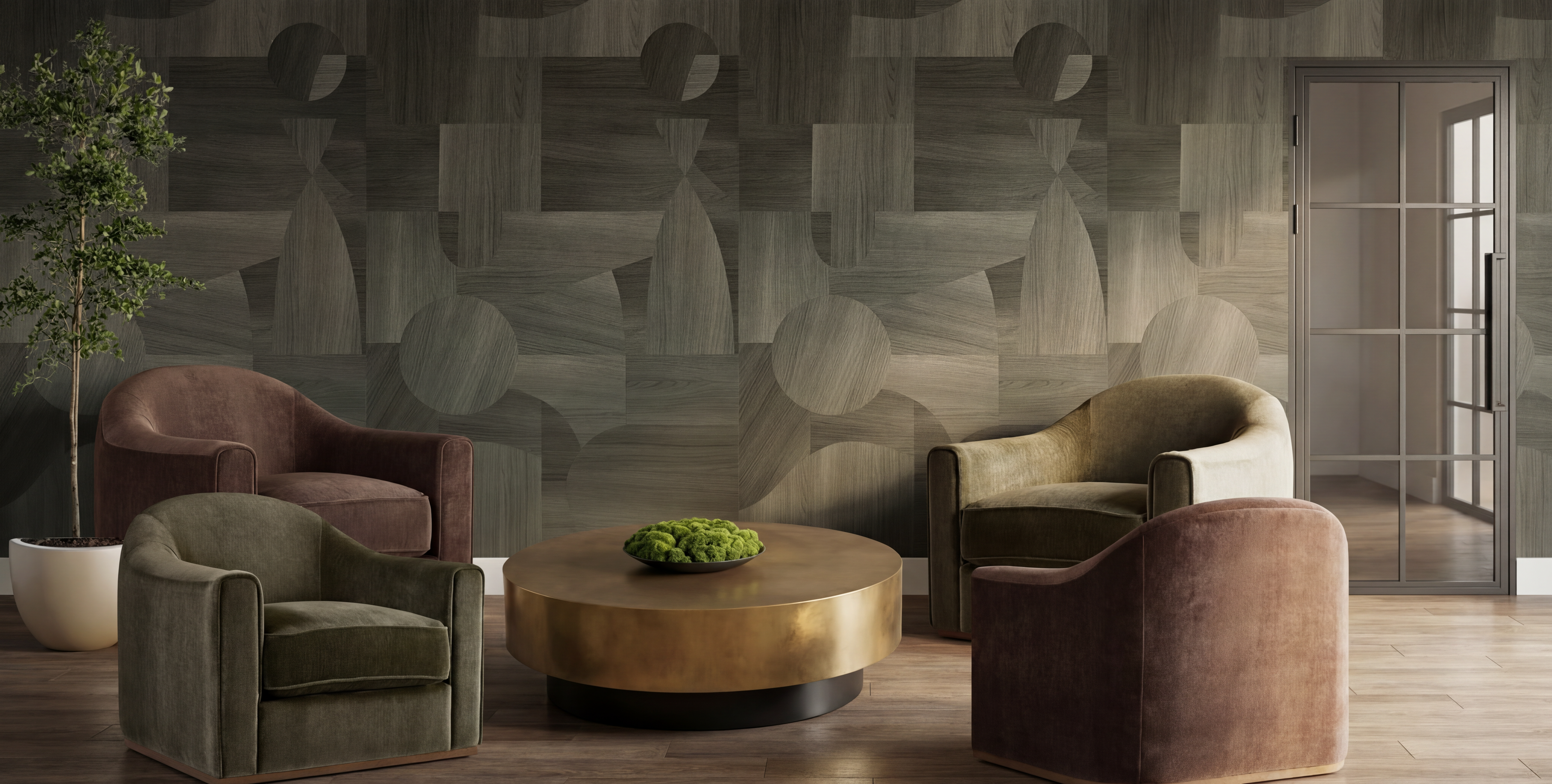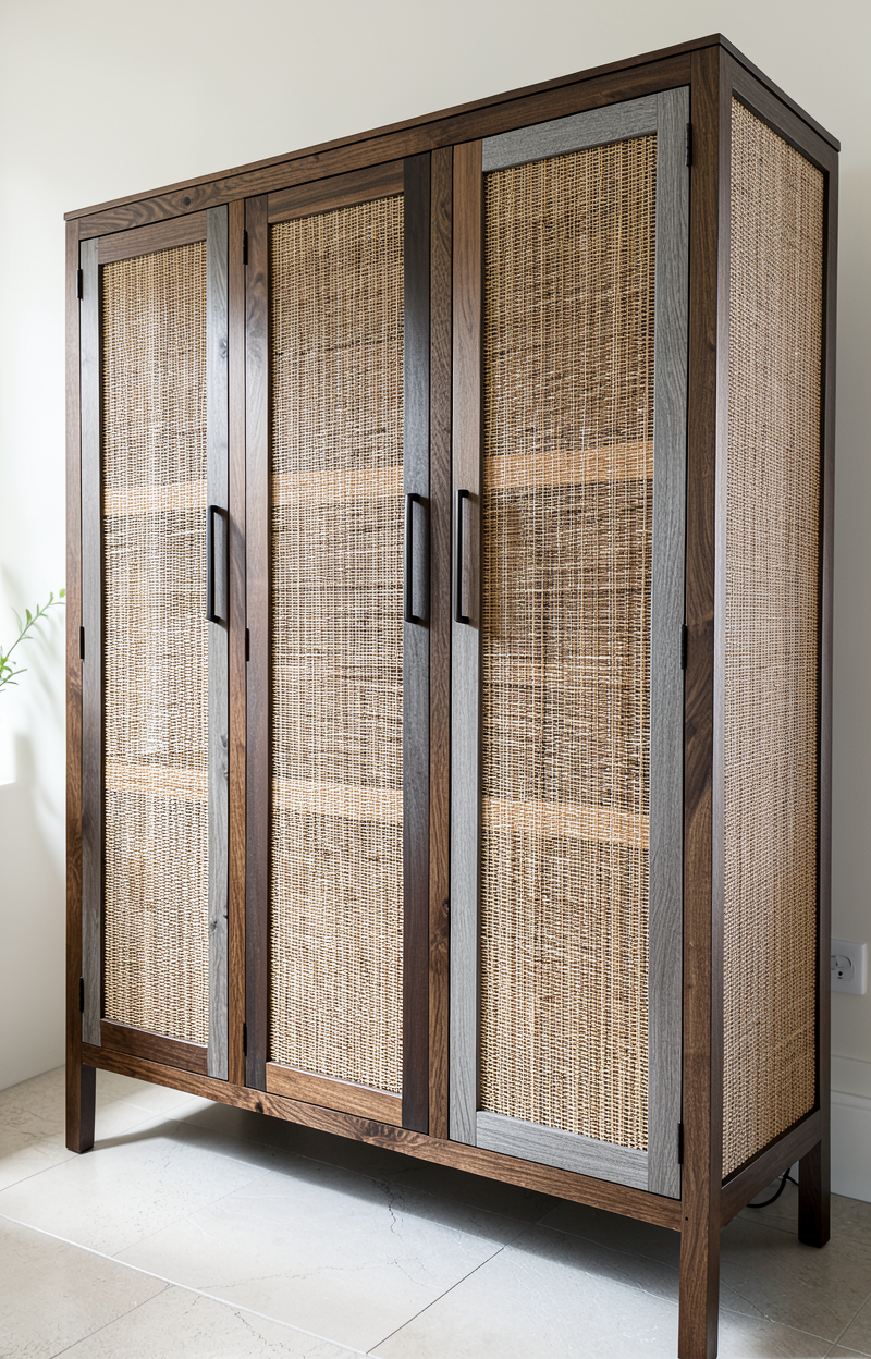 this is a wall in a hallway mudroom with beautiful natural stained knotty walnut cabinets there is a nice modern 2 step crown molding along the top of the cabinets all the handles are a brushed brass the open spaces to the right have a coat hanger in each the floor is a beautiful hard wood there is lots of natural light coming from the right out of frame