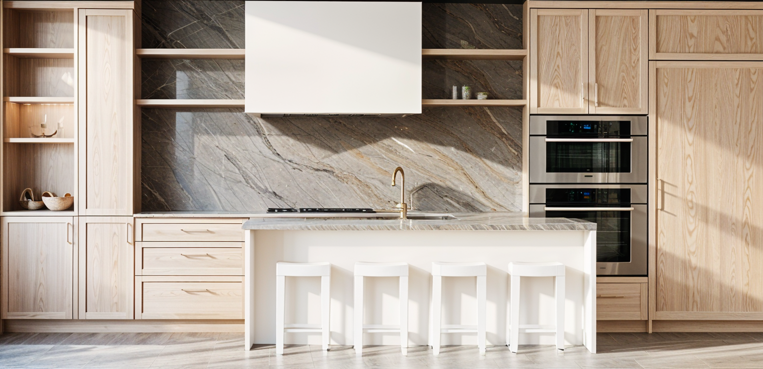 light calacatta vagli polished stone change wood to rift cut light oak with a natural light brown matte finish reduce yellow orange tone significantly overall color should be light neutral brown not honey or golden grain should be linear and calm not high contrast add trim shaker frame to range hood in white do not add anything new in