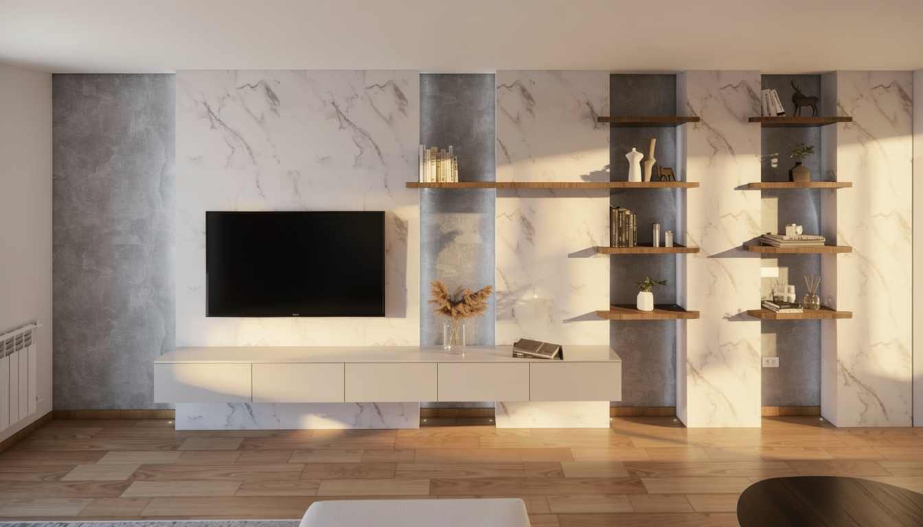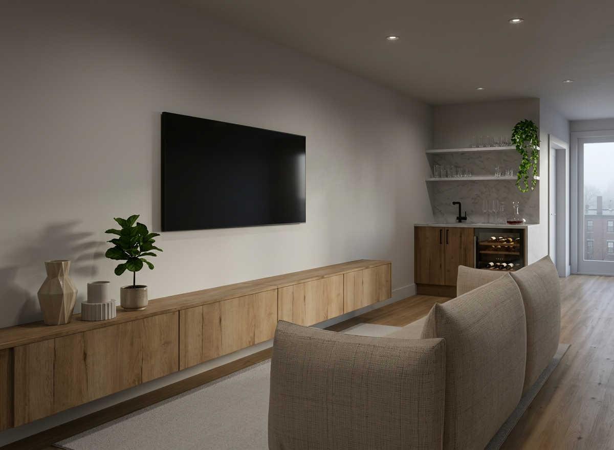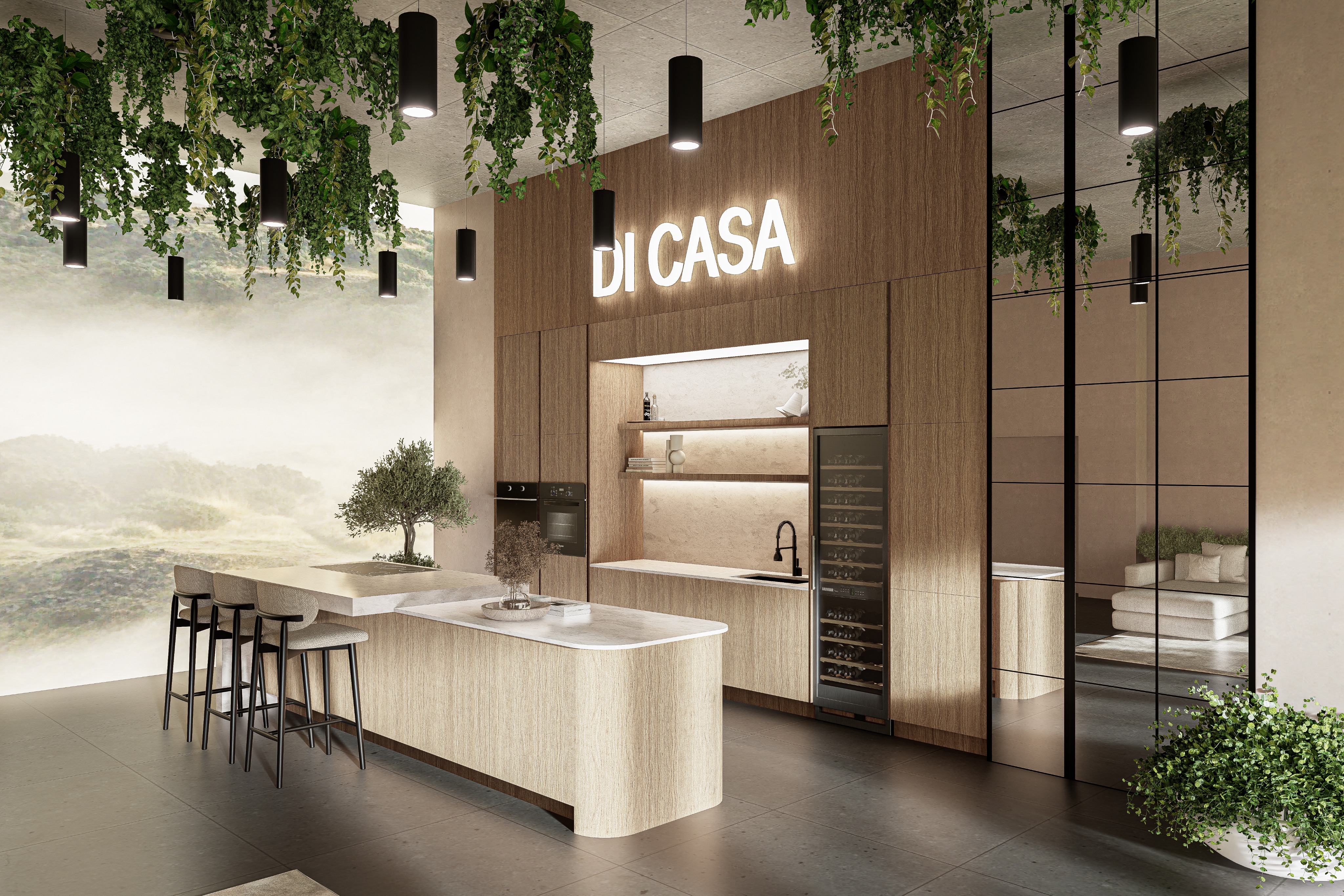 transform this kitchen showroom render into an ultra photorealistic high end architectural visualization keep the exact same design layout island shape cabinetry composition shelving niche built in appliances wine cooler position sink and faucet location stools mirror panels lighting layout ceiling concept camera angle composition and branding placement do not change the design no redesign no moving furniture no removing objects no adding new design elements upgrade the entire render to look like a real luxury showroom photograph with premium material realism refined lighting and highly believable textures focus on ultra realistic materials the wood cabinetry and wall cladding must look like real premium wood veneer with fine grain subtle tonal variation natural pores clean panel detailing and soft matte reflectance the kitchen island should feel highly realistic with accurate surface texture smooth edges realistic stone or solid surface response and premium craftsmanship the backsplash and niche surfaces should have realistic depth soft texture variation and natural light interaction the dark floor tiles should look authentic with subtle reflectivity clean grout lines natural surface depth and realistic finish the mirror wall panels should have accurate reflections depth and clean elegant reflectance without distortion the bar stools should look realistic with refined fabric texture metal frame definition and believable shadows the wine cooler glass and bottles should have realistic transparency reflections and interior depth the sink and black faucet should have crisp material definition and realistic highlights the di casa illuminated logo should glow naturally and professionally not overexposed make the indoor plants highly realistic and keep them exactly as part of the design preserve all hanging greenery and planted elements make the leaves look natural detailed layered and believable improve botanical realism with varied leaf tone subtle imperfections realistic density natural droop and proper shadow casting the ceiling hung plants should feel lush and real not artificial or plastic the potted greenery should have realistic foliage volume and texture make the barisol wallpaper stretched wall finish look real and premium realistic fabric like tension and smoothness subtle material depth and natural surface softness believable light diffusion across the barisol surface clean luxury finish not flat or artificial maintain the exact same color and design intent only make the finish more realistic lighting should be ultra realistic and premium soft natural daylight from the exterior view realistic interior bounce light on the wood stone mirrors and plants accurate contact shadows and ambient occlusion realistic pendant light glow with proper falloff balanced exposure and refined contrast warm elegant cinematic showroom atmosphere the final result should look like a real professionally photographed luxury kitchen showroom with extremely realistic wood plants mirrored surfaces and barisol finish strictly preserve the design and composition 1 1 no design edits no material color changes no added decor only realism enhancement add this final line too priority ultra realistic indoor plants ultra realistic barisol wallpaper finish premium wood veneer realism realistic mirror reflections and photo quality luxury showroom rendering