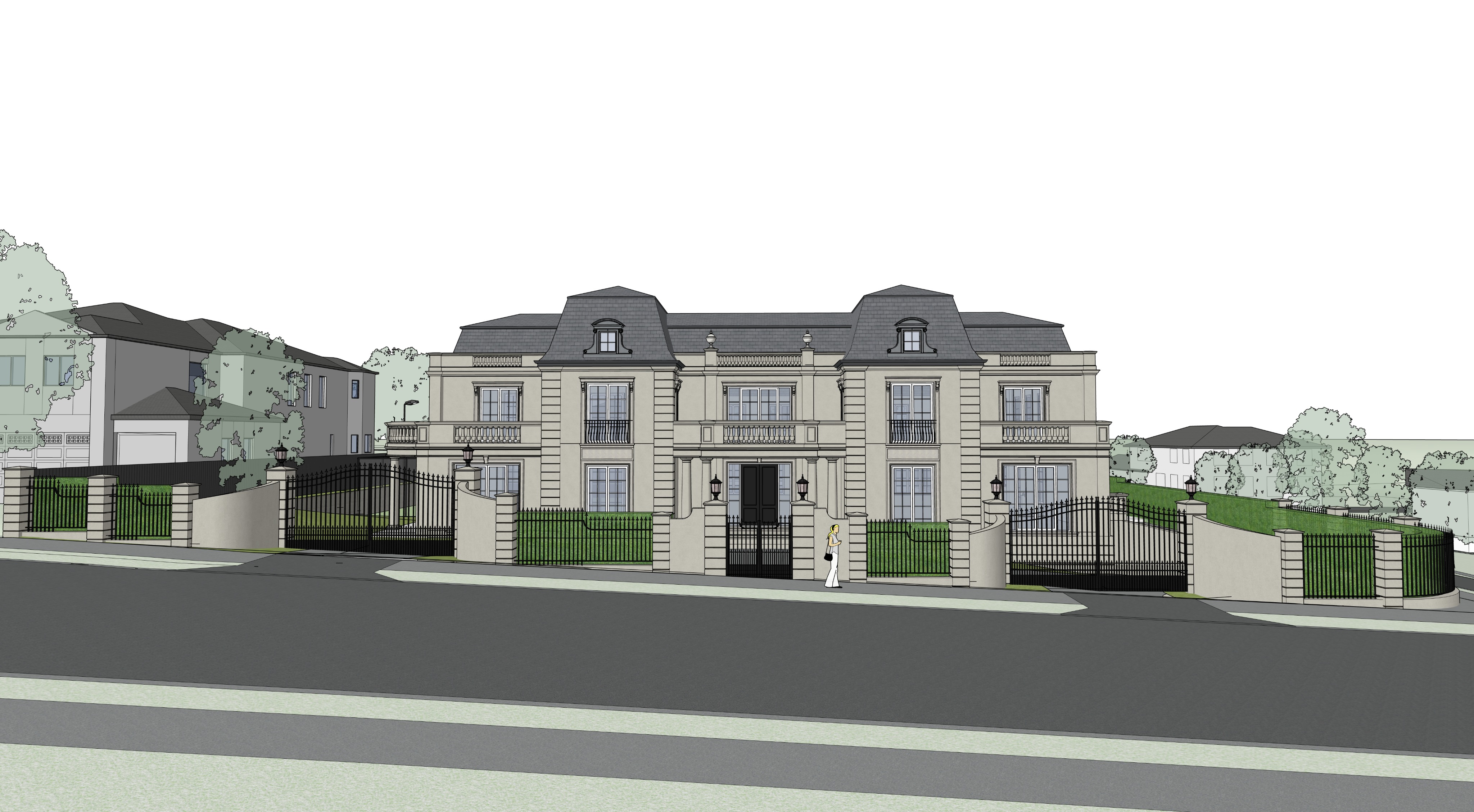 photo realistic render classical home high green hedges fence dramatic lighting award winning overcast at dusk wet slate roofing wet road pedestrian gate with two vehiecular gates on the side