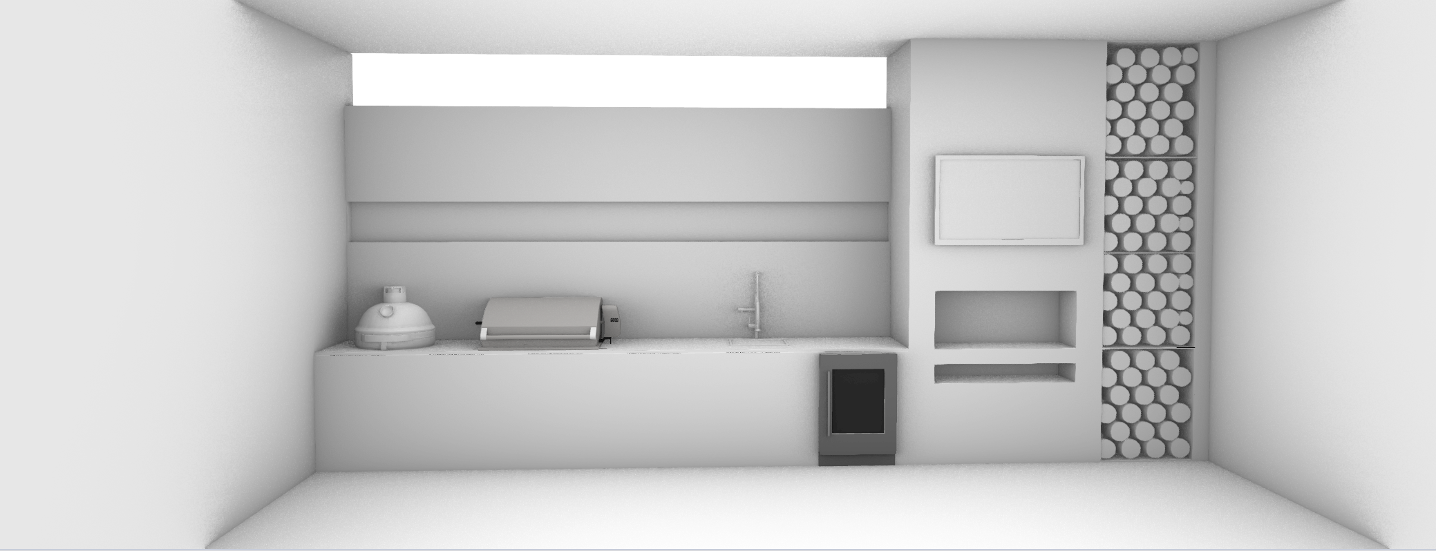 modernist interior shot render this alfresco area i want the kamado joe smoker in the left corner to be the red kamado joe render that grill render the tap and the sink render the mini bar fridge have like a danish walnut sort of colour cabinetry on the bottom that bottom bench have like a black marble on the top bench have a serrano eggshell sort of concrete look render for the wall with the tv on it those are wooden logs feature wall have like black shelving and then do the freestyle the rest actually and also have like a wooden sort of paneled roof like a light coloured wood and then wooden decking electric fireplace under tv with shelf architecture