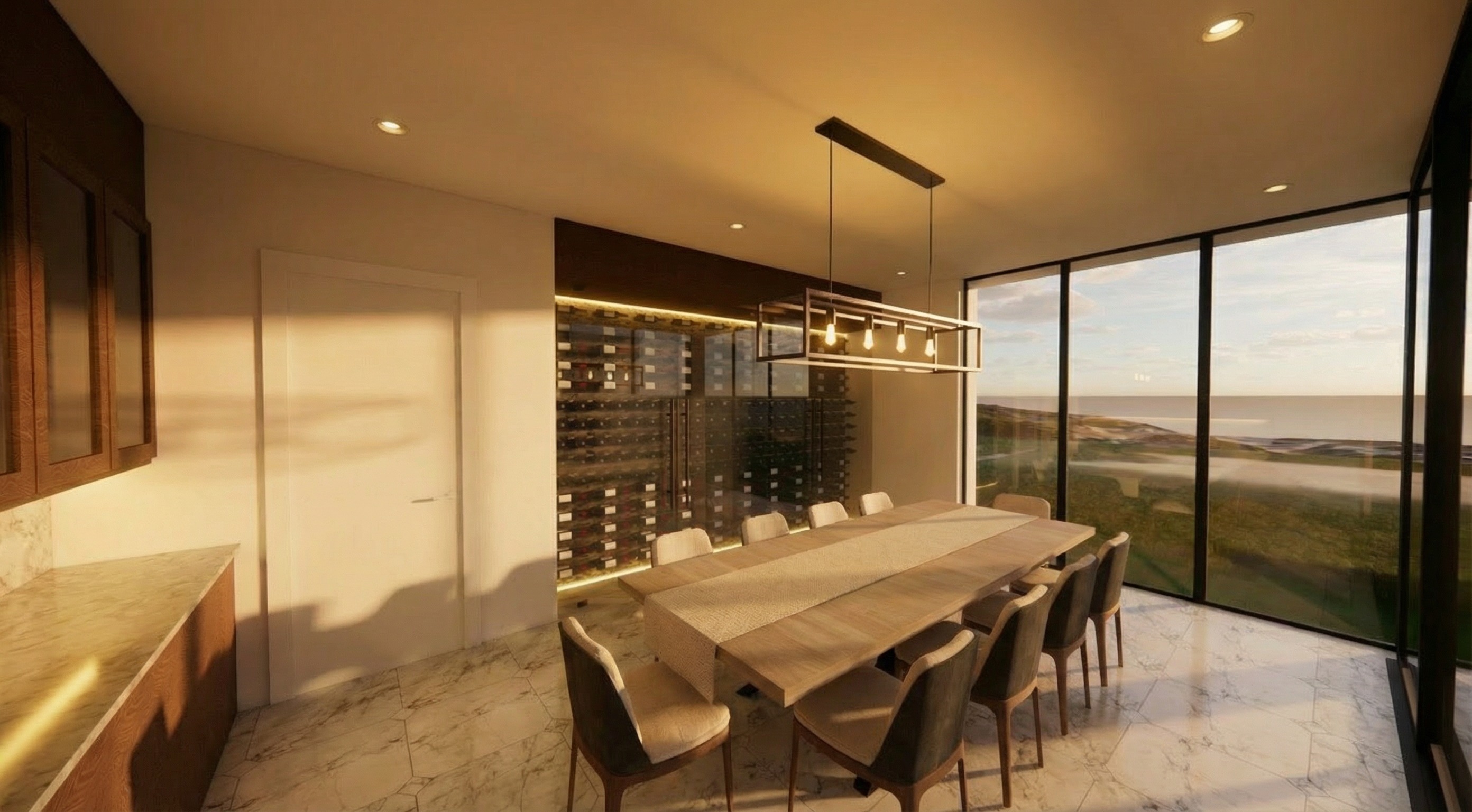 make the light fixture a more modern and globe like fixture make sure all current millwork remains walnut show a quiet urban residential background through the windows make the placemat on the table a little bit shorter but make sure it still goes over the edge of the table