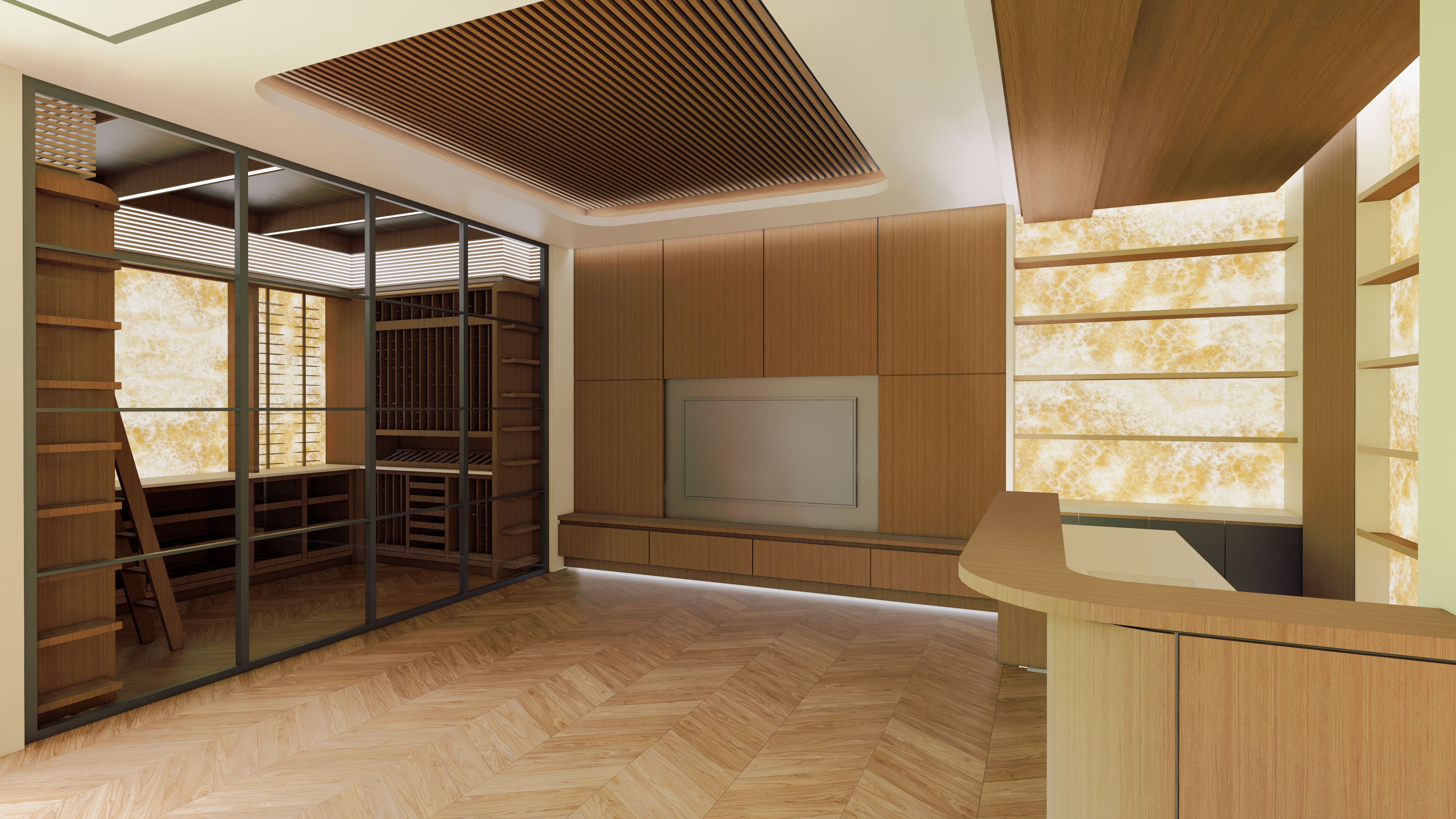 transform the provided interior image into a high end photorealistic render with a warm evening atmosphere subtle golden highlights and a luxurious residential tone all architectural elements joinery geometries ceiling forms wall proportions floor patterns bar layout shelving positions glass partitions and spatial configuration must remain exactly the same with no changes in shape alignment size or location the wine room on the left must remain identical in layout and joinery geometry but the illuminated stone panels behind the shelving must clearly appear as rich warmly backlit stone matching the tone and character of the backlit stone used behind the bar all wine racks and shelving within the wine room must be fully stocked with wine bottles arranged neatly and realistically with enhanced reflections and depth in the glazing the central area must include a comfortable modern sofa placed facing the tv wall along with a soft textured rug positioned beneath it behind the tv the wall panel must be finished in a soft fabric surface with a subtle tactile quality and refined indirect lighting emitting from all recesses around the media wall and ceiling coffer while keeping the wall s geometry and panel layout unchanged the curved bar on the right must remain exactly as designed including all joinery lines and proportions the backlit stone panels behind the bar must render with deeper translucency warm layered glow and realistic crystalline variation timber shelving must stay in its exact configuration but display premium wine and spirit bottles arranged tastefully without modifying the shelves themselves lighting should emphasise warm evening tones soft reflections enhanced material richness and gentle shadow gradients across all surfaces improve realism through wood grain clarity polished timber sheen stone translucency fabric texture and precise glass reflections while keeping the entire space exactly as originally designed with no object relocation or geometric alteration