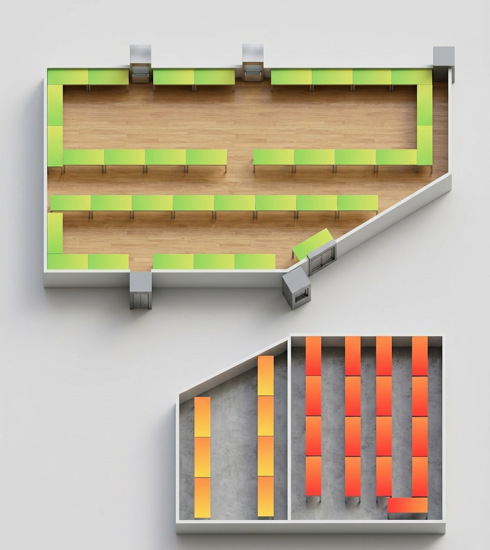 convert this floor plan into a realistic isometric 3d view of a full house show the space from an elevated angle with furniture walls and details visible the colored rectangle boxes are empty tables use the same furniture as shows on the plan do not change the orientation of the floorplan