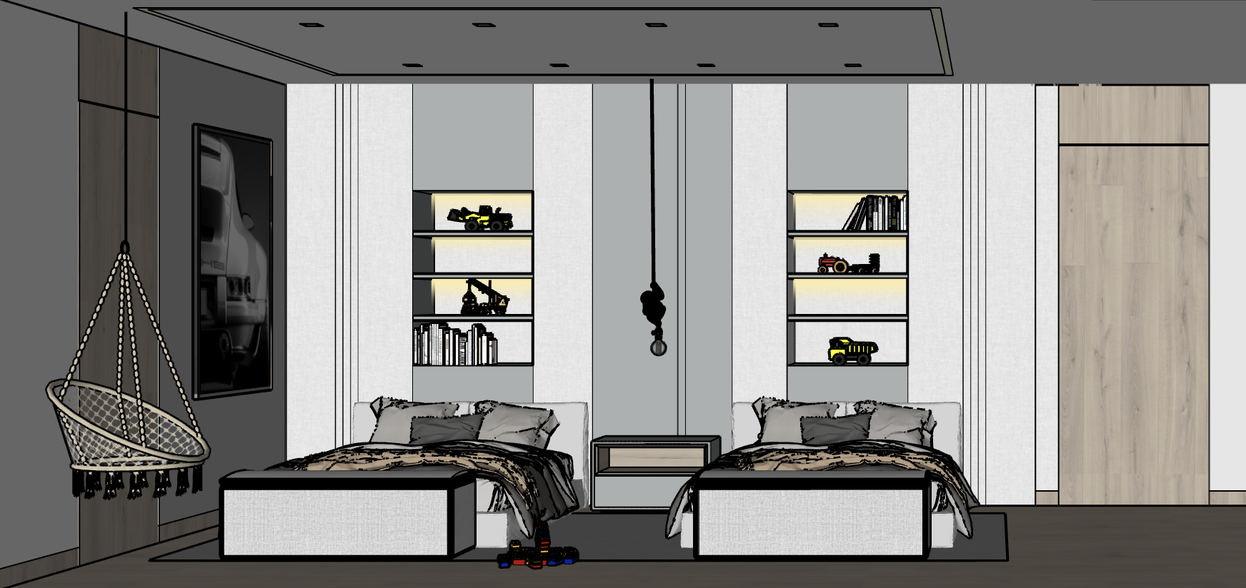 render a modern twin bedroom with a clean minimalistic style two beds with light gray upholstered bases and layered bedding in neutral beige and gray tones sit side by side between them is a small floating nightstand in wood and gray finish the back wall features built in illuminated shelving niches with books and toy construction vehicles displayed a trunk stool is placed on the foot of each bed a hanging swing chair made of woven rope with tassels is placed on the left side and a large black and white car artwork decorates the wall behind it the ceiling has a white panel with modern spot lighting and the walls combine soft sool beige paint light wood panels and textured white surfaces the floor is a light wood tone adding warmth and contrast the ambiance should be photorealistic with soft neutral cool daylight and subtle shadows creating a cozy yet sophisticated atmosphere for children