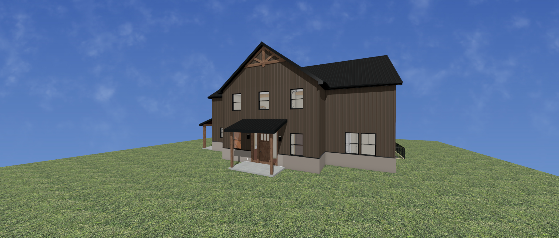a modern two story farmhouse with dark vertical board and batten siding black metal roofing exposed wooden trusses under the front gable and natural timber posts supporting the entry porch retain the exact structure window placements rooflines concrete foundation and overall geometry from the reference image place the home on a gentle grassy slope but add a clean smooth concrete front driveway leading up to the entry porch surround the property with a lush dense forest backdrop of tall mixed trees position the sun behind the trees so warm natural sunlight streams through the branches creating soft rays and dappled highlights on the house produce ultra realistic lighting crisp shadows detailed textures on wood siding and metal roof and a bright clear blue sky with light clouds hyper realistic rendering 8k resolution architectural visualization quality
