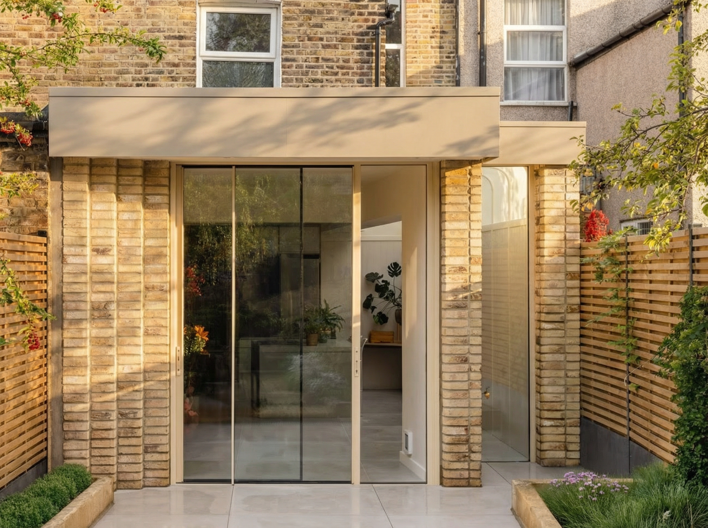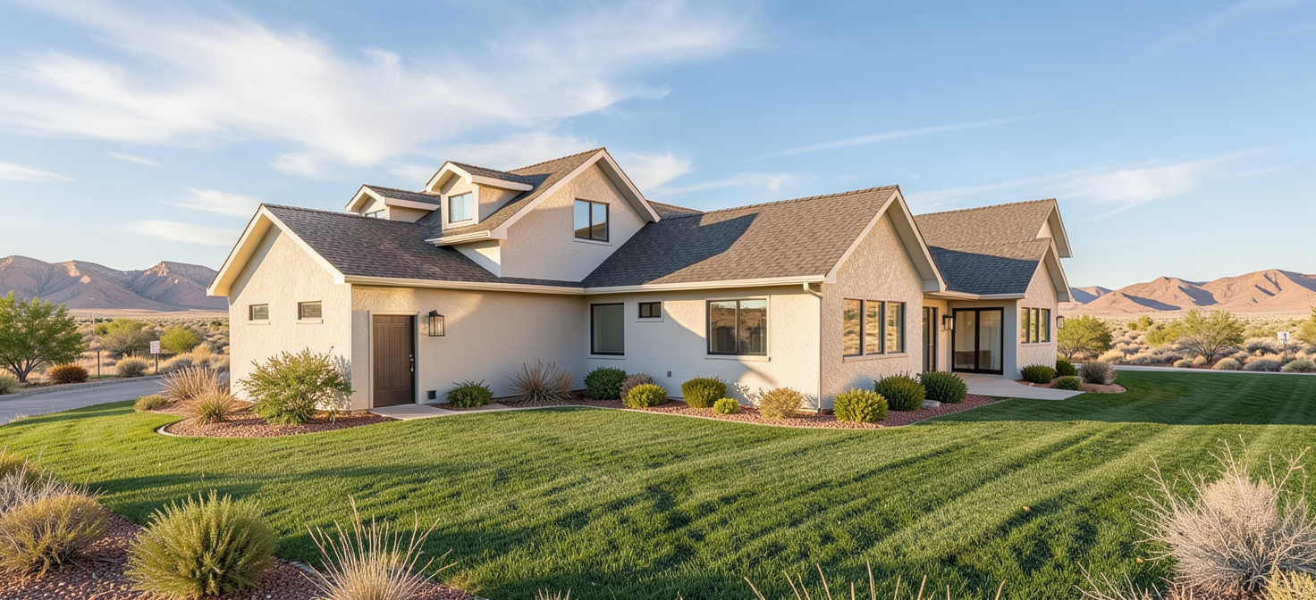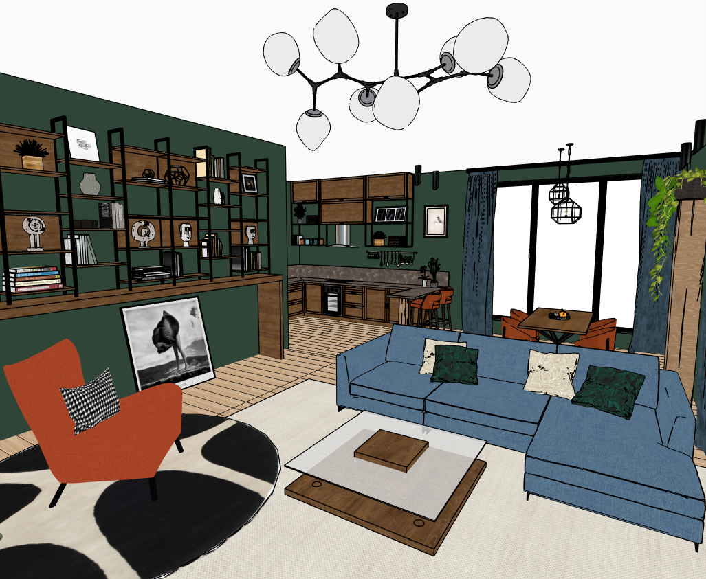 create a soft loft atmosphere the wall is dark green ral6005 the parquet is oak colored striped the sofa is blue in front of it is a thin beige structured carpet in front of the sofa is a glass topped coffee table in walnut color the armchair and dining chair are terracotta colored the armchair is shaped like a curved winged armchair with a black and white cushion on it under the armchair is a black and white round rug the curtains are dark blue a little shiny through the windows we can see a big city the spot lights dimly illuminate the wall the ceiling ball lights give a pleasant light their lampshades are frosted glass the frame is black in contrast the kitchen is walnut colored with a grayish brown marble countertop the picture has a soft bright cozy light show everything where it is in the picture