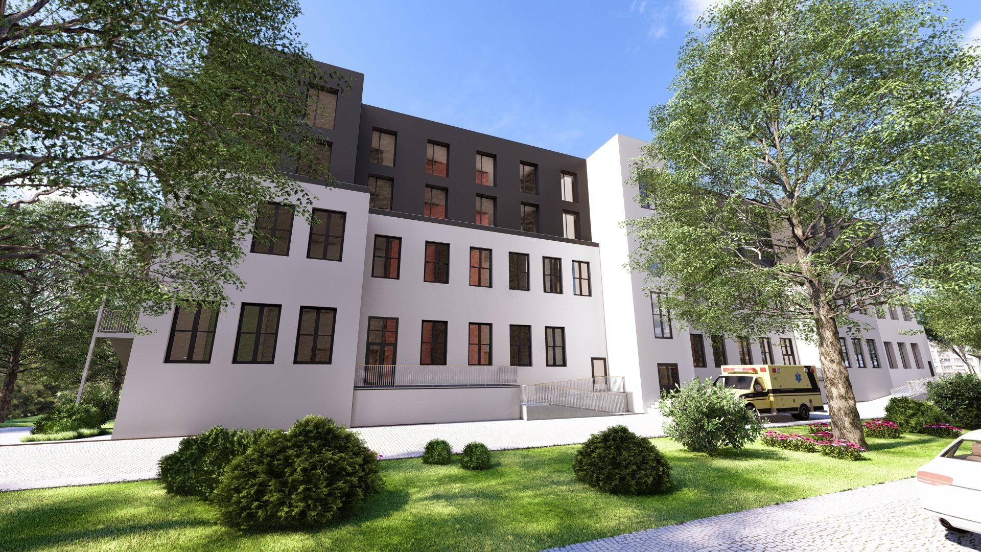 nicholas grimshaw exterior shot add interiors to windows add street lamps add garden furniture for disabled add people silhouettes architecture