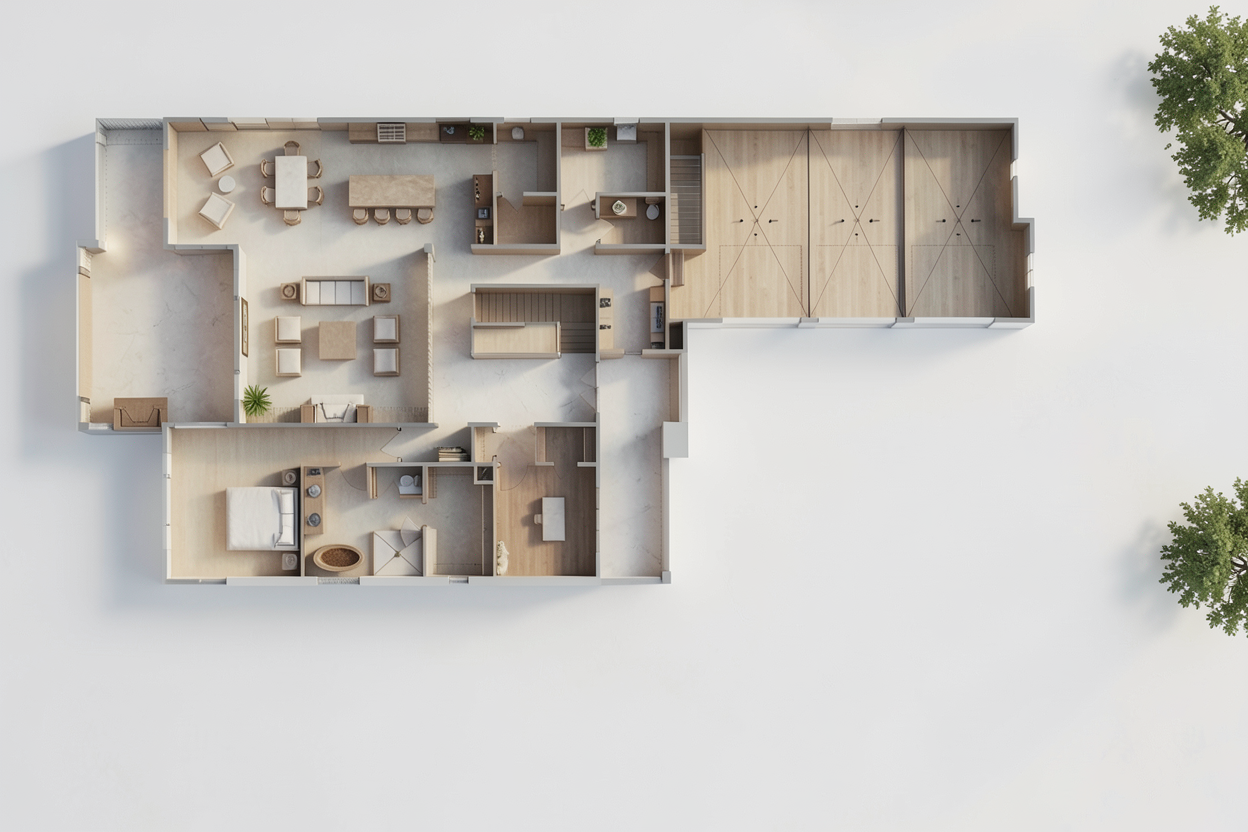 convert this 2d floor plan into a fully modeled 3d architectural floor plan maintain exact room dimensions wall thicknesses door swings and window placements shown on the plan create clean realistic 3d spatial geometry extrude walls accurately from the plan and add appropriate floor and ceiling materials include essential architectural details such as door frames skirting window trims and column placements keep the furniture layout functional and proportionate based on typical architectural standards use natural soft lighting to clearly visualize spatial relationships produce a professional architectural 3d visualization suitable for client presentations