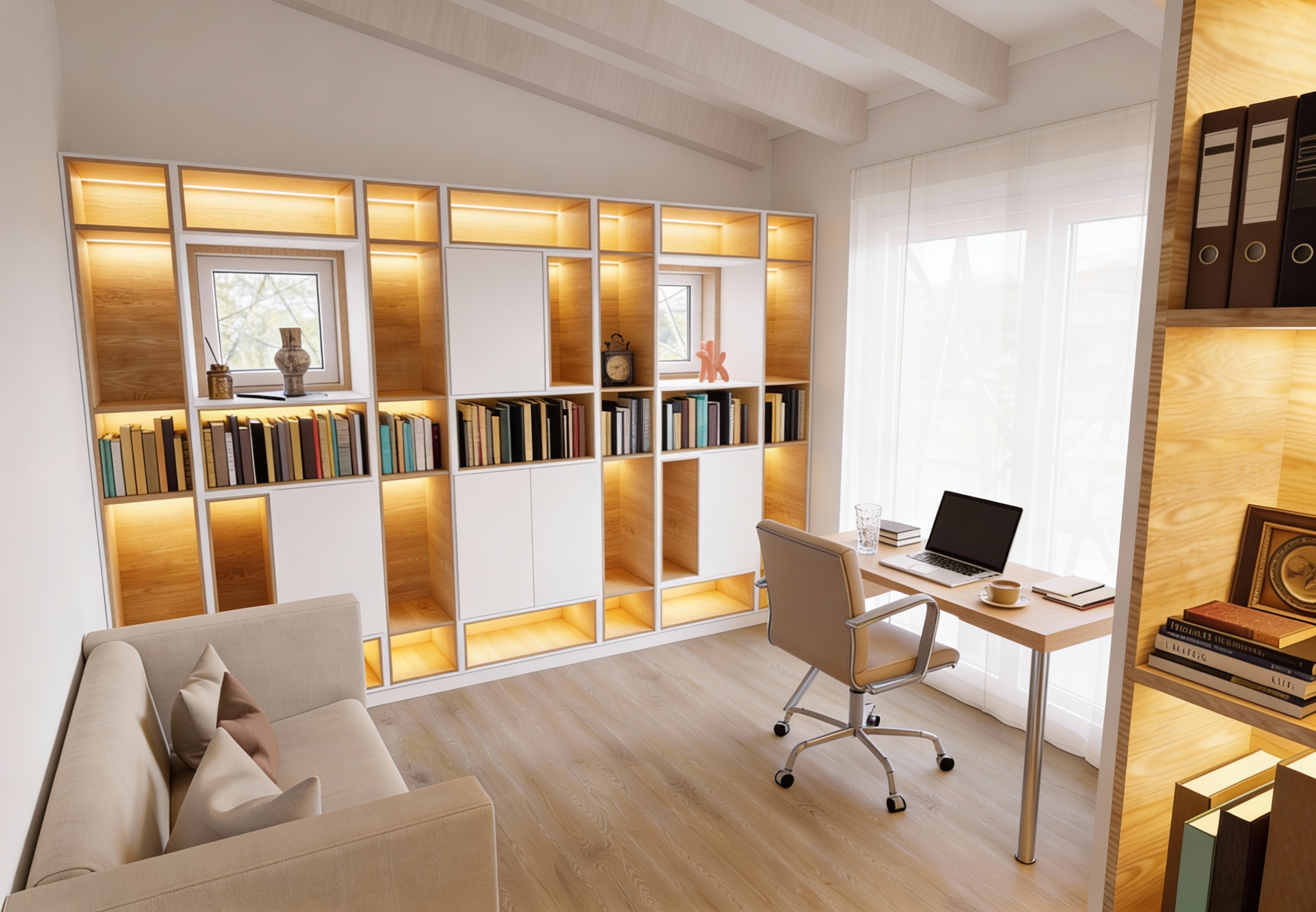 do not change anything walls are cream colour ceiling is white light wood on a floor coffee table has darg wood leg and travertine desk add some town view trough window balcony has a glass railing