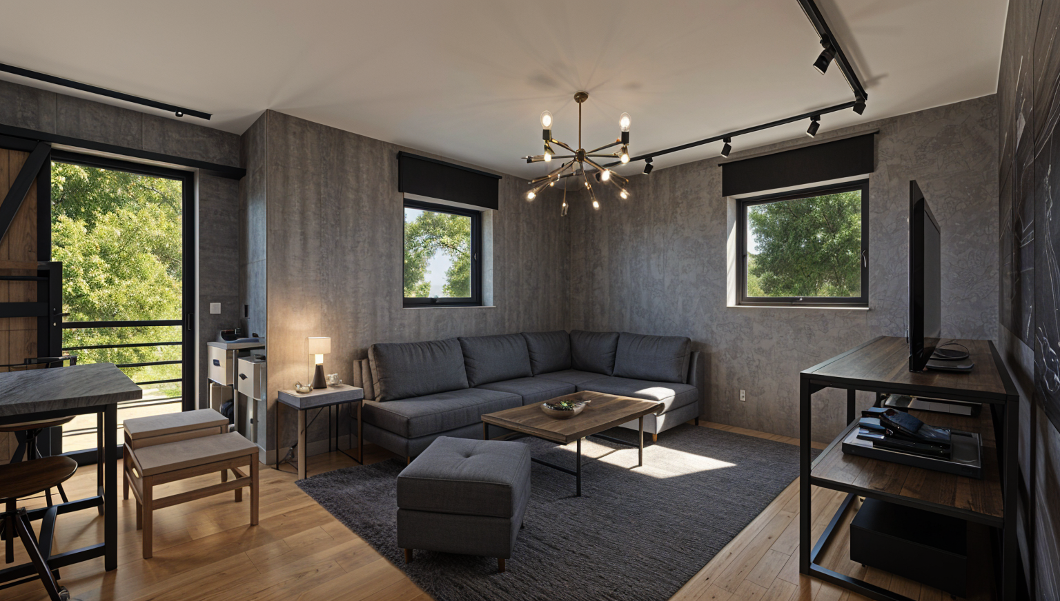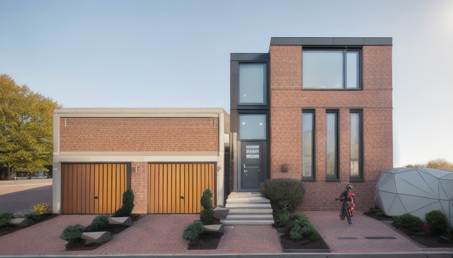 sustainable design exterior shot render a two story house with mediterrean design featuring a front porch with a gabled roof use soft white for the exterior walls and a contrasting ceramic tiles for the roof and wood railings incorporate large windows with woodenf frames and shutters to enhance natural light the stairs should be a limestone color surround the house with lush greenery and vibrant flowers in shades of olives and oranges set the atmosphere during a clear day with a bright blue sky and gentle sunlight casting soft shadows architecture