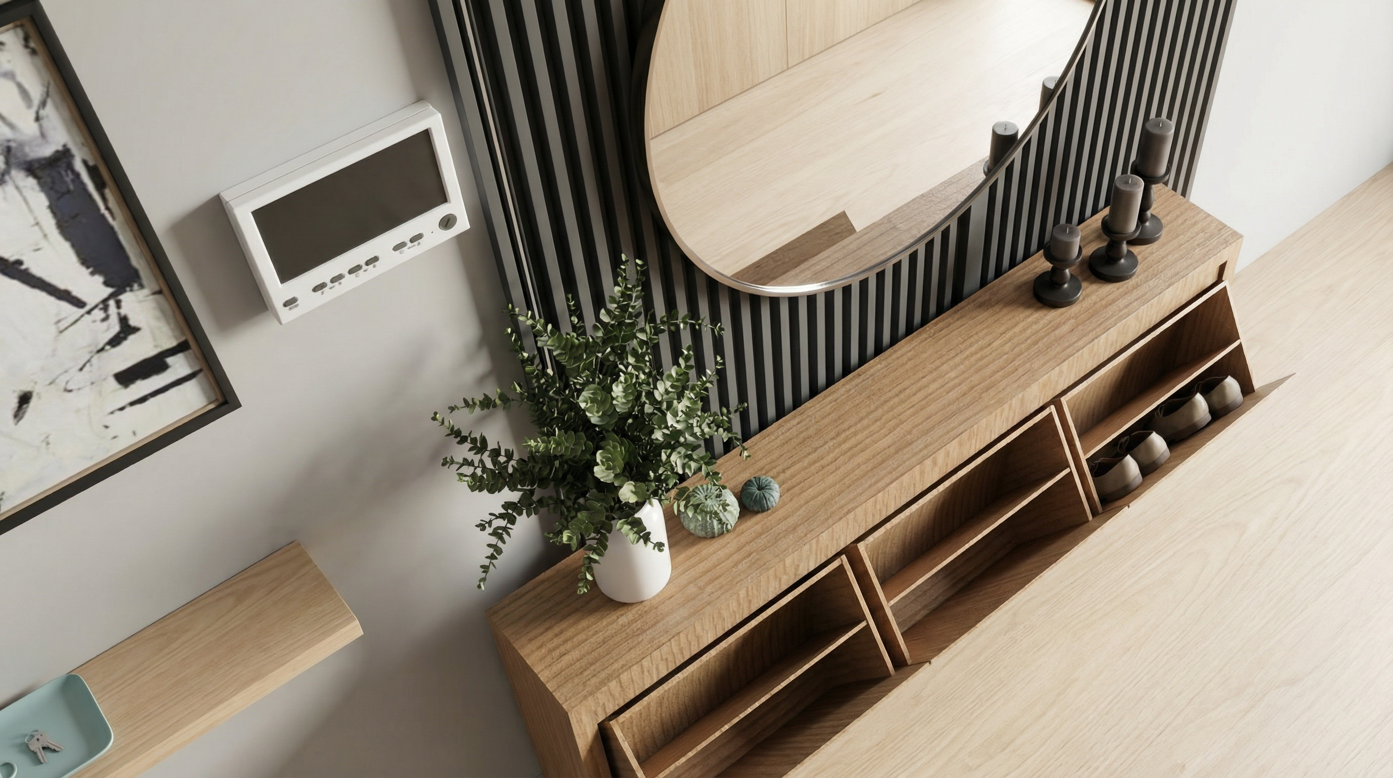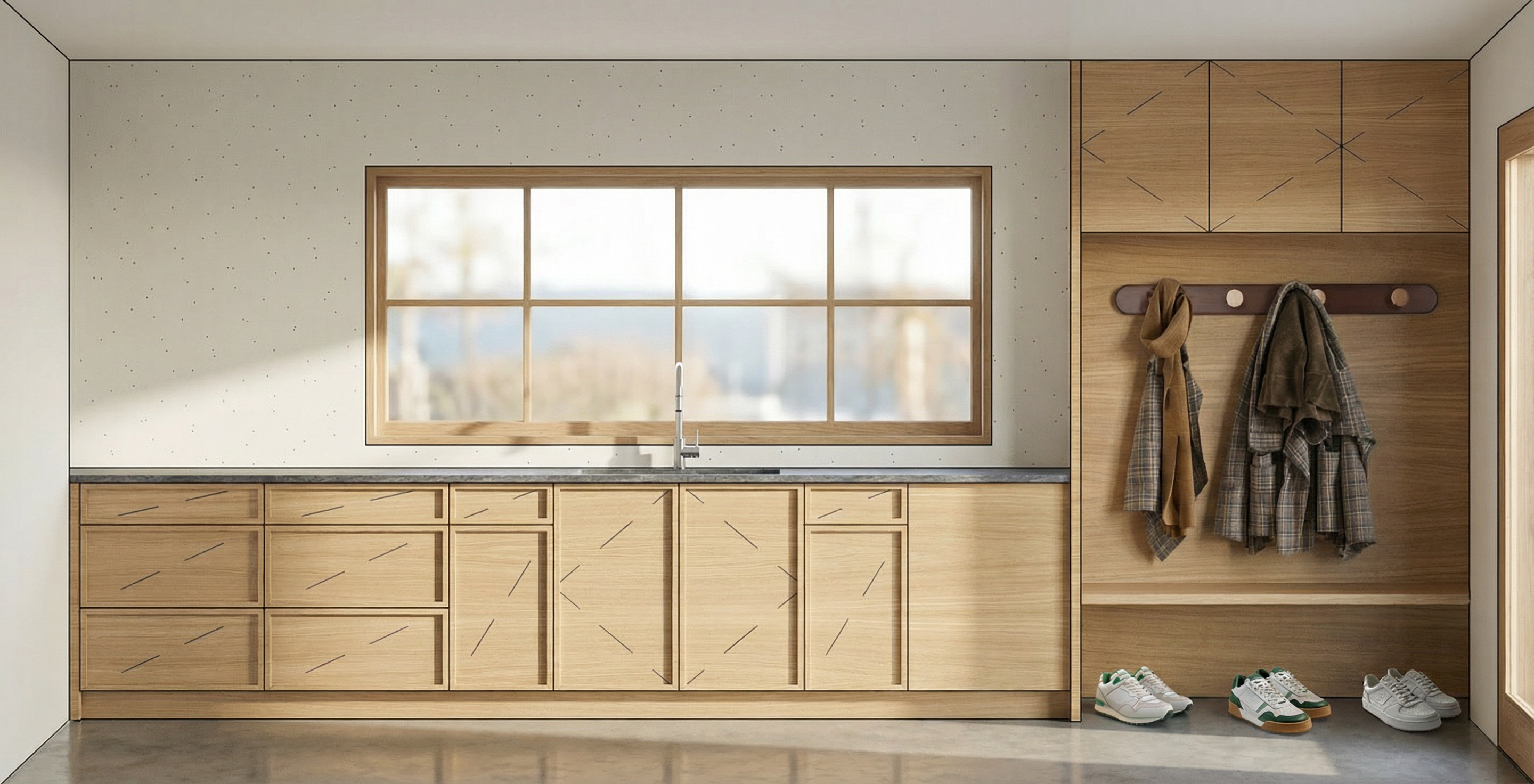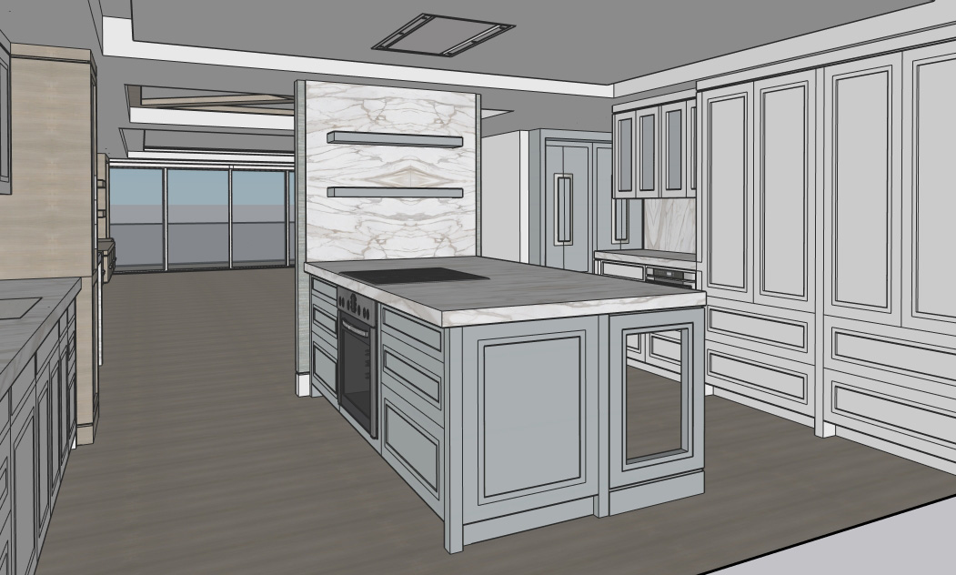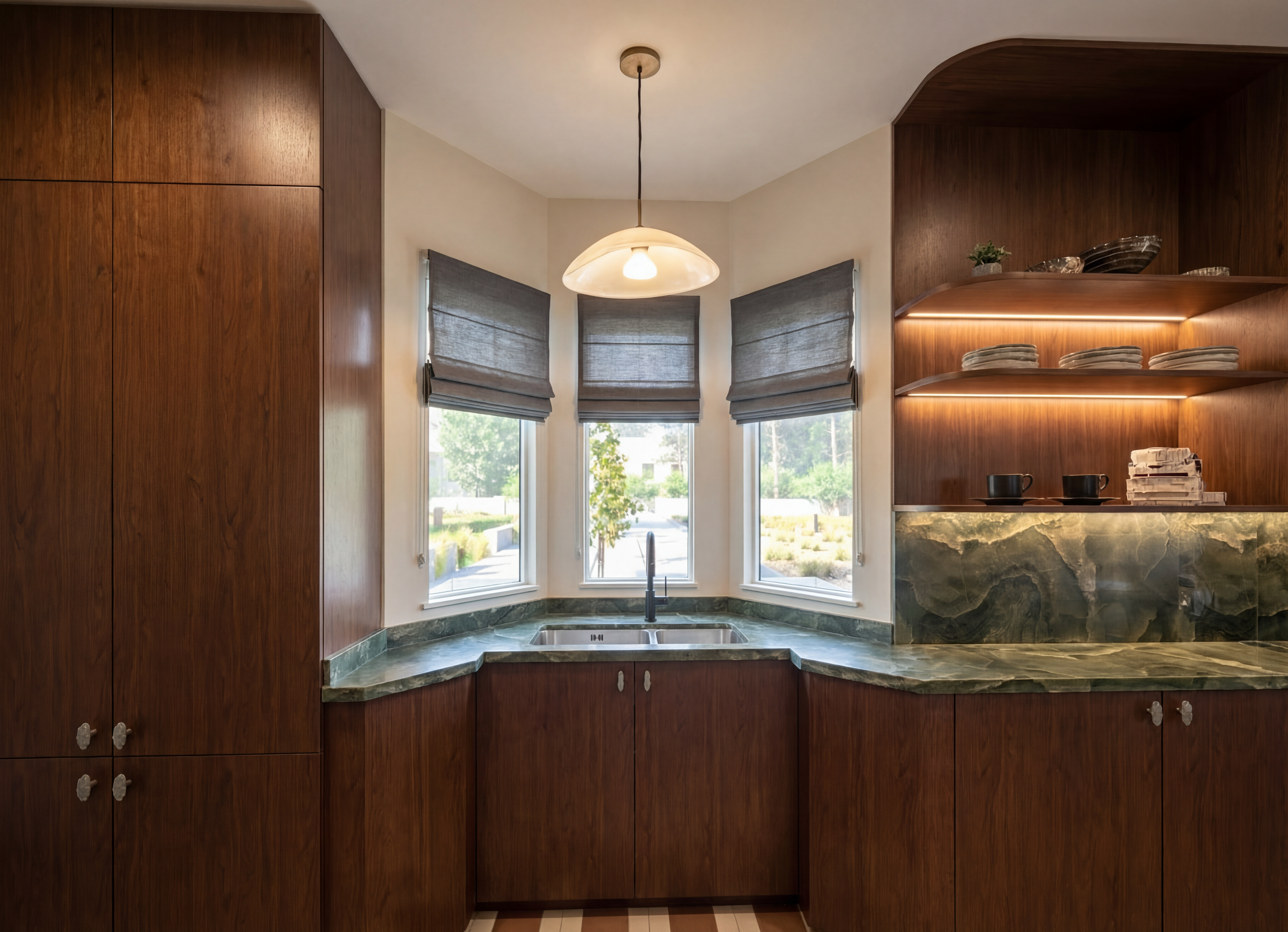 transform the provided elevation into a hyper realistic interior photograph that is indistinguishable from a real professionally shot interior design photograph this must read as a real space captured by a camera not a rendering not a visualization not architectural cg not concept art and not an illustration geometry lock non negotiable preserve the exact original geometry layout proportions ceiling details wall depths panel divisions openings doors cabinetry locations millwork dimensions built ins and circulation paths with zero architectural changes nothing may move scale simplify or be reinterpreted geometry must remain absolutely unchanged camera derivation critical derive the camera position height angle and framing strictly from the uploaded elevation eye level interior photography centered or naturally balanced composition 24 35mm interior lens feel no dramatic angles no stylized framing do not reuse or approximate camera framing from any previous image remove all drawing artifacts completely remove all linework cad edges drafting outlines diagrammatic shapes sketch artifacts nothing may appear outlined flat schematic or illustrative the elevation must be visually reinterpreted as a finished real interior photograph material realism rules wood if present smooth solid plank material extremely subtle restrained grain matte or soft satin finish only no graphic patterns no decorative striping no visual noise wood must absorb light gently never glossy or sharp fabric upholstery if present soft compression subtle seams gentle shadowing natural fabric texture no flat color blocks stone slabs if present light natural veining soft organic variation low contrast no symmetry no bold or busy patterns stone must feel heavy and grounded walls fine surface texture slight tonal variation never flat paint edge construction realism all edges corners joints and transitions must be softly broken and physically realistic no razor sharp corners no cgi perfect edges slight construction tolerances only everything must read as fabricated installed and dimensional lighting photographic behavior lighting must behave like real high end interior photography natural daylight only unless otherwise specified realistic light bounce gentle shadow falloff uneven exposure distribution subtle brightness variation across surfaces avoid studio lighting uniform illumination over clean exposure global illumination look slight softness is preferred over sharpness camera image imperfections very important introduce subtle photographic characteristics gentle lens softness micro exposure variation natural contrast roll off mild atmospheric depth primary plane sharp background slightly softer the image must feel captured not generated absolute constraints no creative interpretation no stylization no exaggeration no added or removed elements any deviation from the original elevation geometry or intent is unacceptable negative prompt always include architectural rendering 3d visualization cgi unreal engine octane vray sketchup look flat textures graphic lines outlined edges over sharpened studio lighting concept art illustration ai look plastic materials glossy wood high contrast grain perfect symmetry keep design as shown in the picture keep the design as it is in image light cabinets are white and brown cabinets are white oak keep design in the image as it is including materials