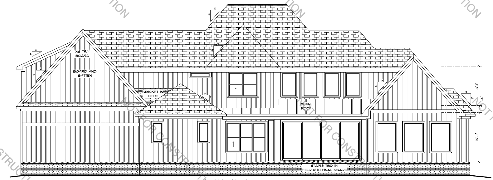 this house will have a black shingle roof black windows black trim the board batton and brick base will be white