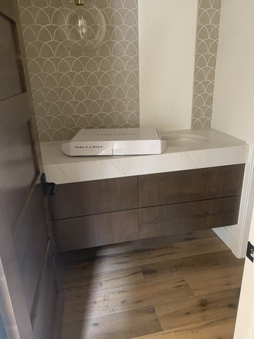 do not change the cabinets in any way preserve the exact cabinet colors materials finishes dimensions door and drawer styles hardware spacing alignment and all geometry exactly as shown do not alter the countertop shape backsplash appliances flooring lighting fixtures or wall structure only remove the construction materials clutter and mess from the scene clean the room and make it look finished and staged add a few simple tasteful home accessories appropriate for the style of the space but do not add or remove any furniture windows or architectural elements maintain the original lighting direction and realism enhance clarity and polish the photo while keeping the cabinetry and room design completely unchanged do not alter the lighting to keep the cabinet colors as they are in the image remove the box on the counter put a frameless mirror on the drywall between the wallpaper add a gold faucet to the sink turn the lights on stage for a modern minimalistic powder bath remove the door