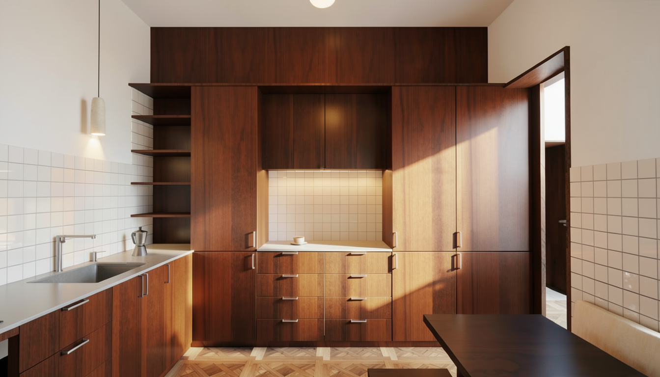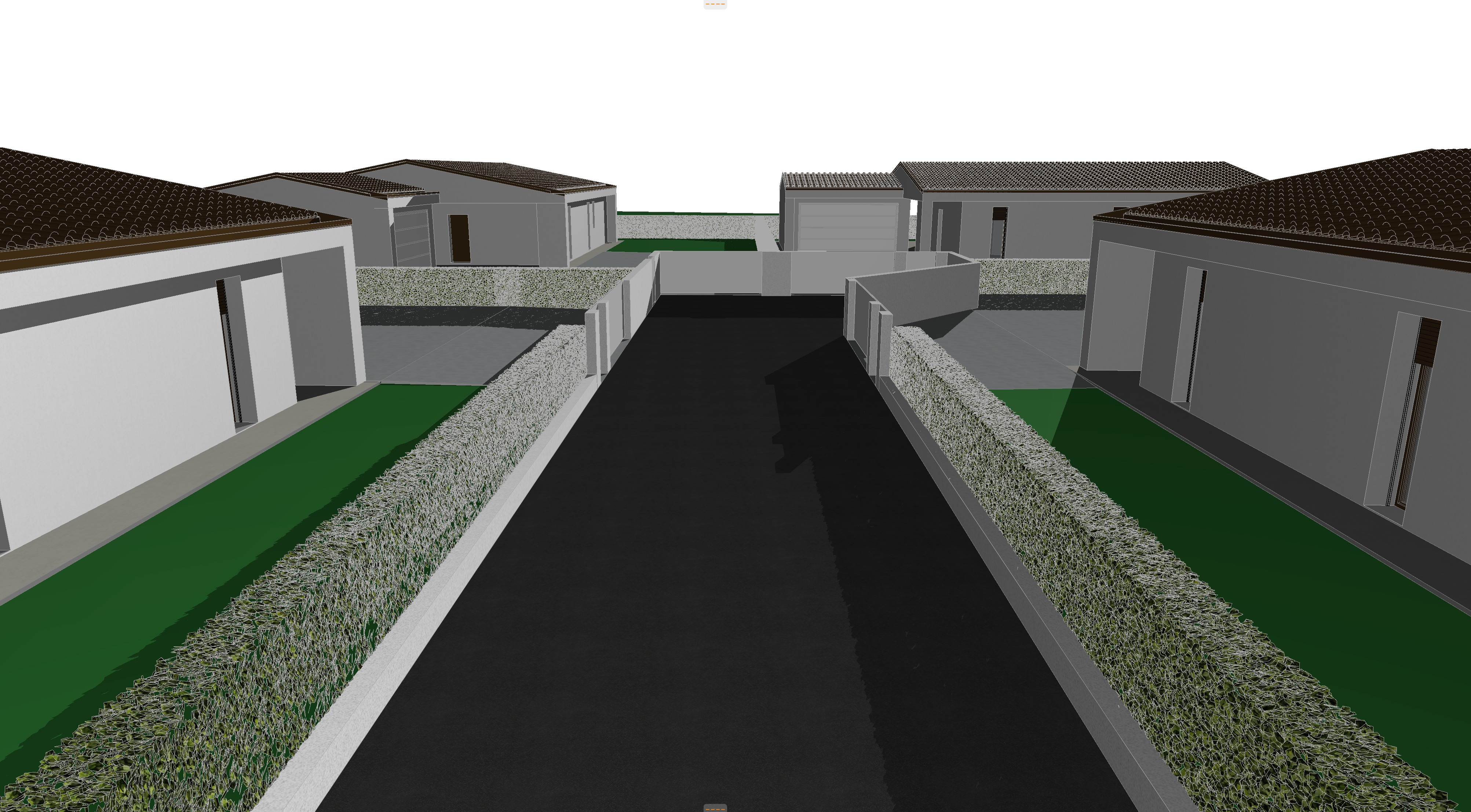 render a photorealistic 3d bird s eye view of this villas using white plaster for the walls brown masonry tiles on the roof brown gutters brown windows frames exterior concrete pavement green hadges green garden whit some tree and vegetation don t add path in the garden at the moment the central avenue is made in asphalt the gates of every villa is made full metal white panel