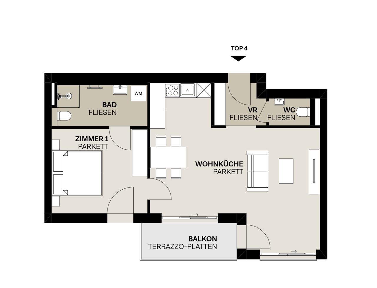 a high end 3d isometric top view floor plan of a modern apartment top 4 the layout includes a large wohnk che living kitchen and zimmer 1 bedroom featuring light oak parkett flooring the vr entrance wc and bad bathroom feature clean light grey ceramic floor tiles include a minimalist kitchen with a stove and sink along the top wall the living area contains a sleek sofa and a small dining table with four chairs the bedroom features a double bed with neutral linens outside there is a balkon balcony with grey terrazzo plates walls are crisp white and the lighting is bright natural daylight minimalist aesthetic hyper realistic architectural visualization 8k resolution