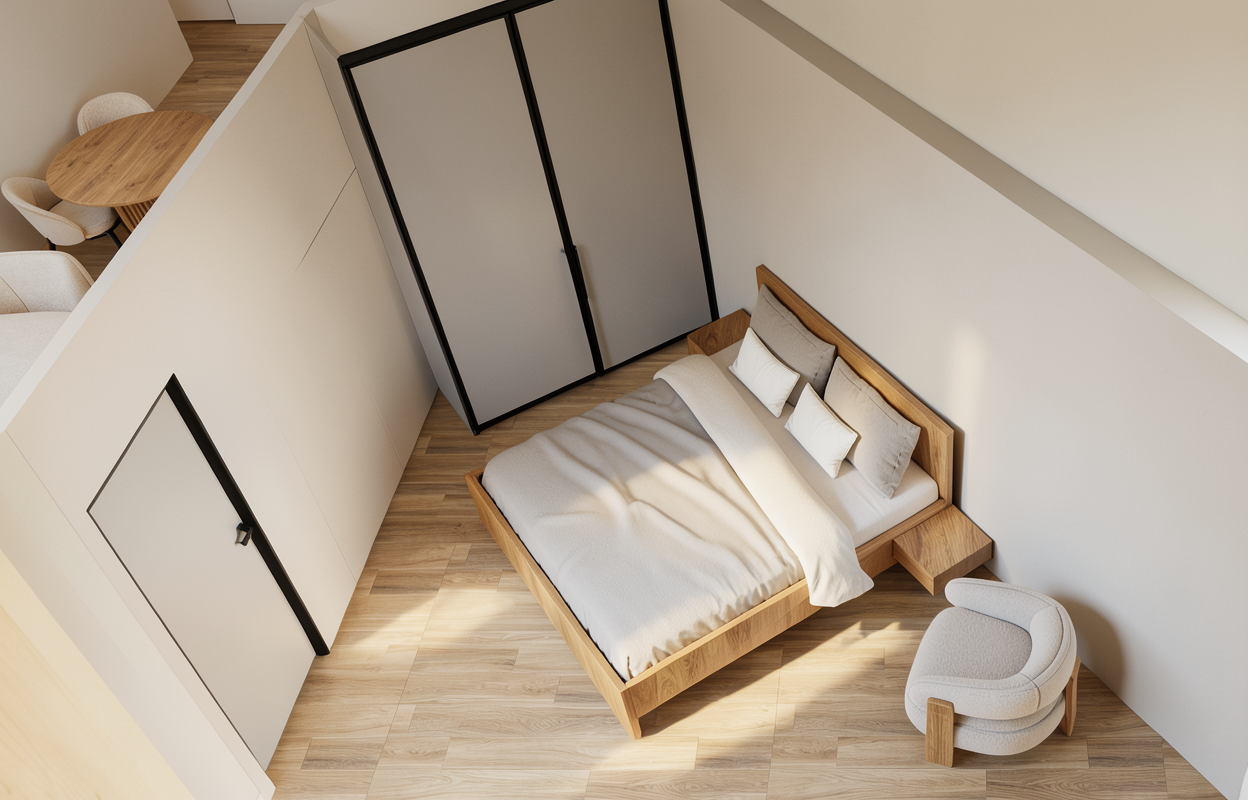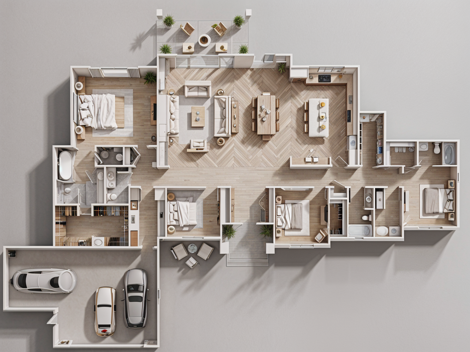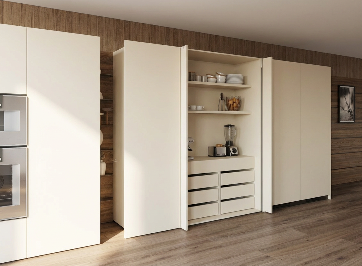 design a sleek modern kitchen interior featuring white cabinets with soft matte texture and subtle black handles the countertop and backsplash should have a polished taj mahal quartzite the atmosphere is bright and airy with sunlight streaming through the windows casting gentle shadows on the floor include a high end stainless steel oven the hood surround is a warm venetian plaster that complements the taj mahal quartzite use warm wooden flooring to bring a cozy feel the walls are painted in light beige creating a calm and sophisticated ambiance the ceiling should be a soft white to enhance the spacious feel