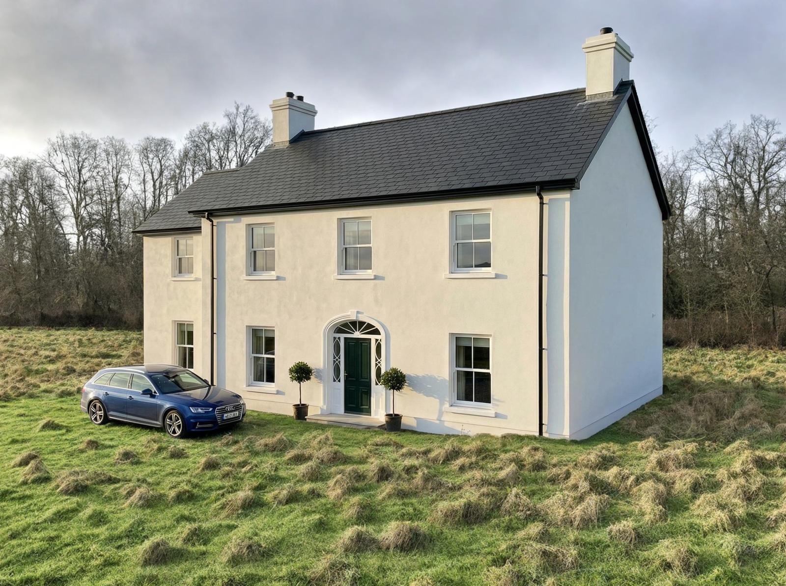 show driveway with kerbing paving around the house cut grass with native hedging