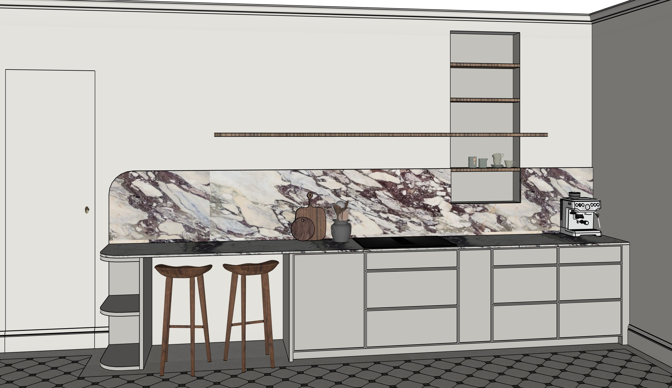the apartment is on the 3rd floor of a parisian building the walls are in light greige the stone is calacatta viola the cabinets are in blackened from farrow and ball https www farrow ball com fr peinture blackened the wooden shelves and stools are in walnut the floor in in black and light beige cabochon tiles like these https www ligerio fr p dallage a cabochons en pierre du nivernais attribute pa epaisseur 1 5 cm attribute pa finition finition brossee attribute pa dimensions 30 cm x 30 cm gad source 1 gad campaignid 22580861264 gbraid 0aaaaacovxwoqoy2u daf1vivokbpblzvq gclid cjwkcajwwjzpbhbreiwajfhrntcp0bnzlynykaejdbbbwtwgj mcma0bvnsgm0xike6zgrx9gzfjirocdzqqavd bwe