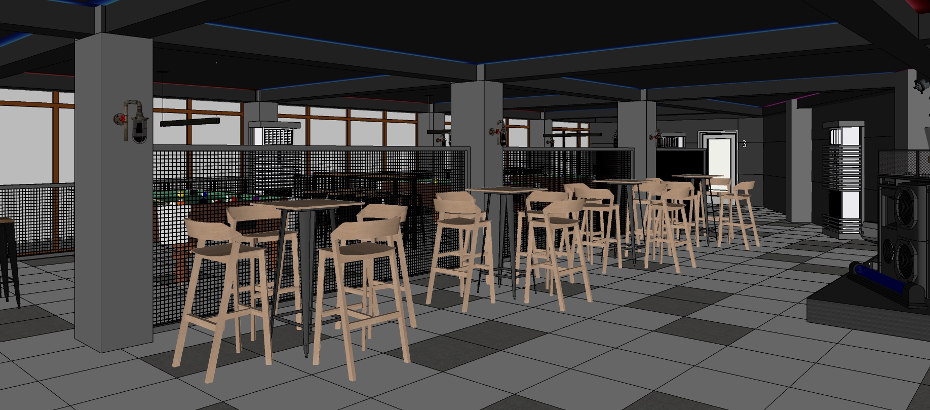 render a bar interior maintain the photo cove ceilings with led lights based on the picture industrial interior design