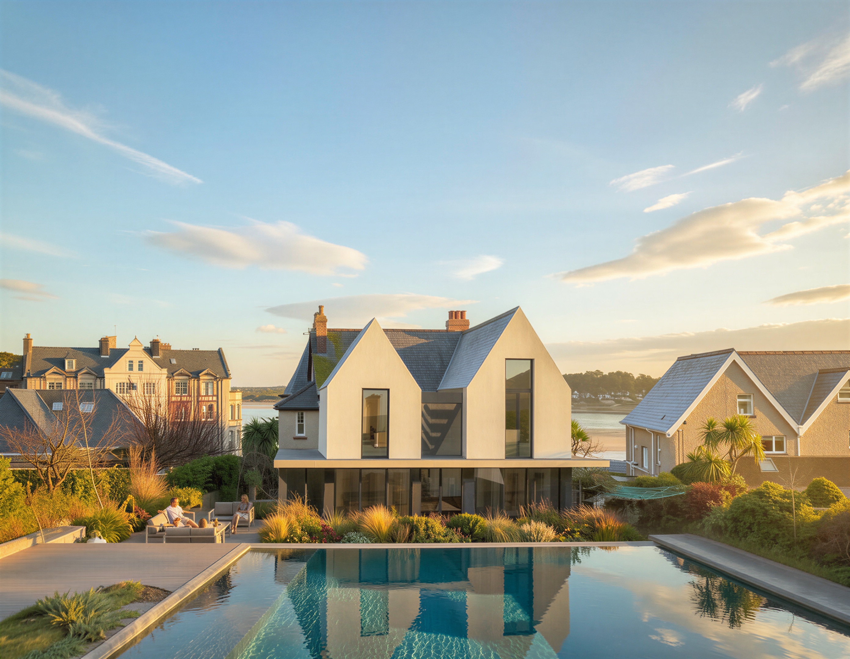 without changing anything else can you remove the people sitting on the terrace and make the roof of the new white rear gable extensions in a grey zinc but keep the main facing roof in the existing slate change the white rendered extension material for a pale portland stone and add a little reflection to the glass in between the 2 white extensions at 1st floor