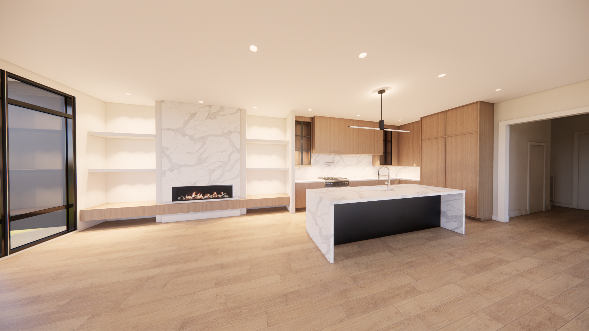 ultra photorealistic cinematic rendering of a kitchen inside a luxury transitional home natural midday sunlight with soft shadows and bright ambient lighting realistic reflections on marble glass and metal surfaces pbr wood grain texture detail with fine anisotropy leica 35mm full frame aesthetic with shallow depth of field editorial color palette warm whites rich walnut wood and soft daylight neutrals balanced highlights natural contrast and soft reflections for a refined architectural digest style composition