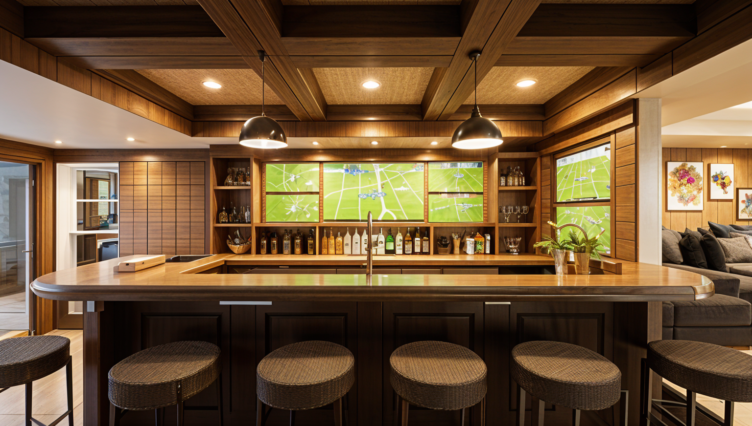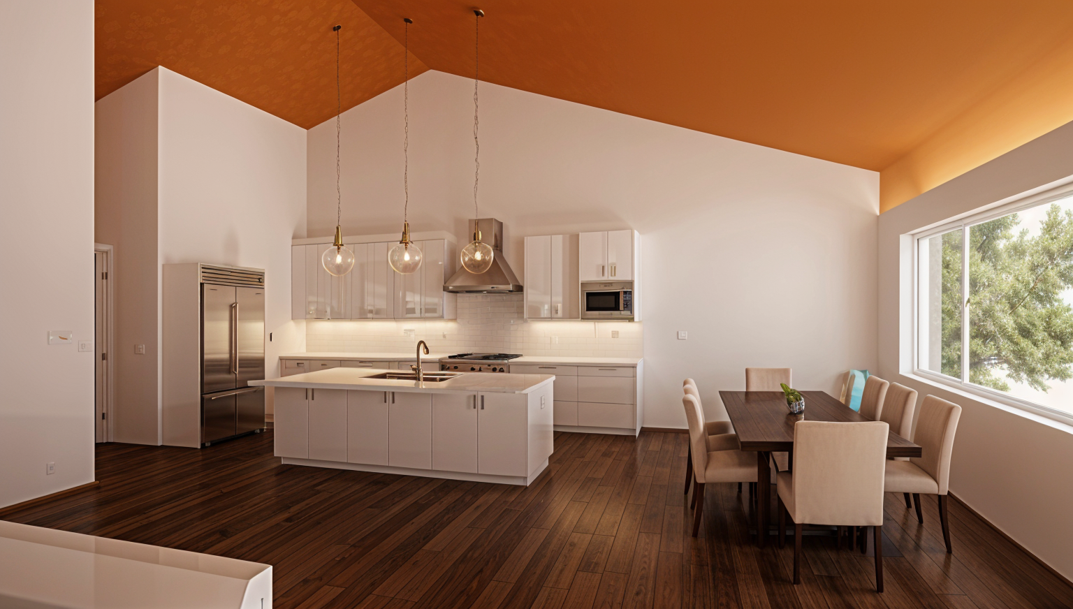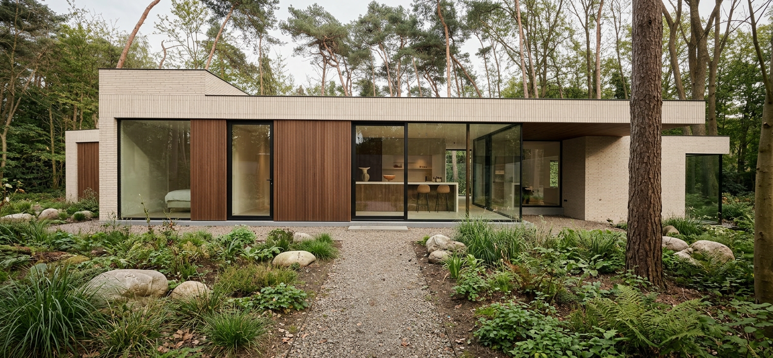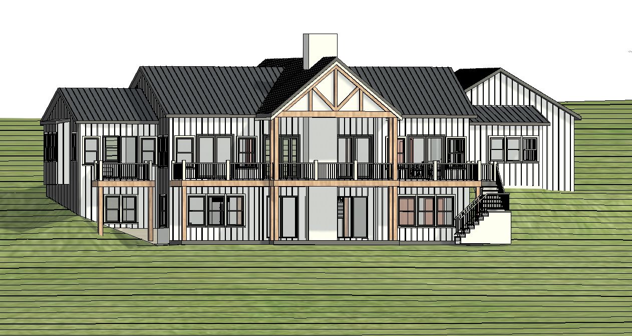a modern two story farmhouse with soft beige vertical board and batten siding black standing seam metal roofing exposed wooden truss details on the rear gable and natural timber posts supporting the full length covered patio retain the exact structure window arrangement patio columns balcony chimney rooflines foundation height and proportions exactly as shown in the reference image add a the house should be integrated naturally into the sloped terrain surround the property with a lush dense forest of tall mixed evergreens and hardwoods place the sun behind the trees so warm golden sunlight beams through the branches casting soft rays and subtle dappled highlights across the grass create ultra realistic lighting crisp shadows detailed textures in the wood siding and glass reflections and a vibrant clear sky with light atmospheric depth render in hyper realistic architectural visualization quality 8k resolution
