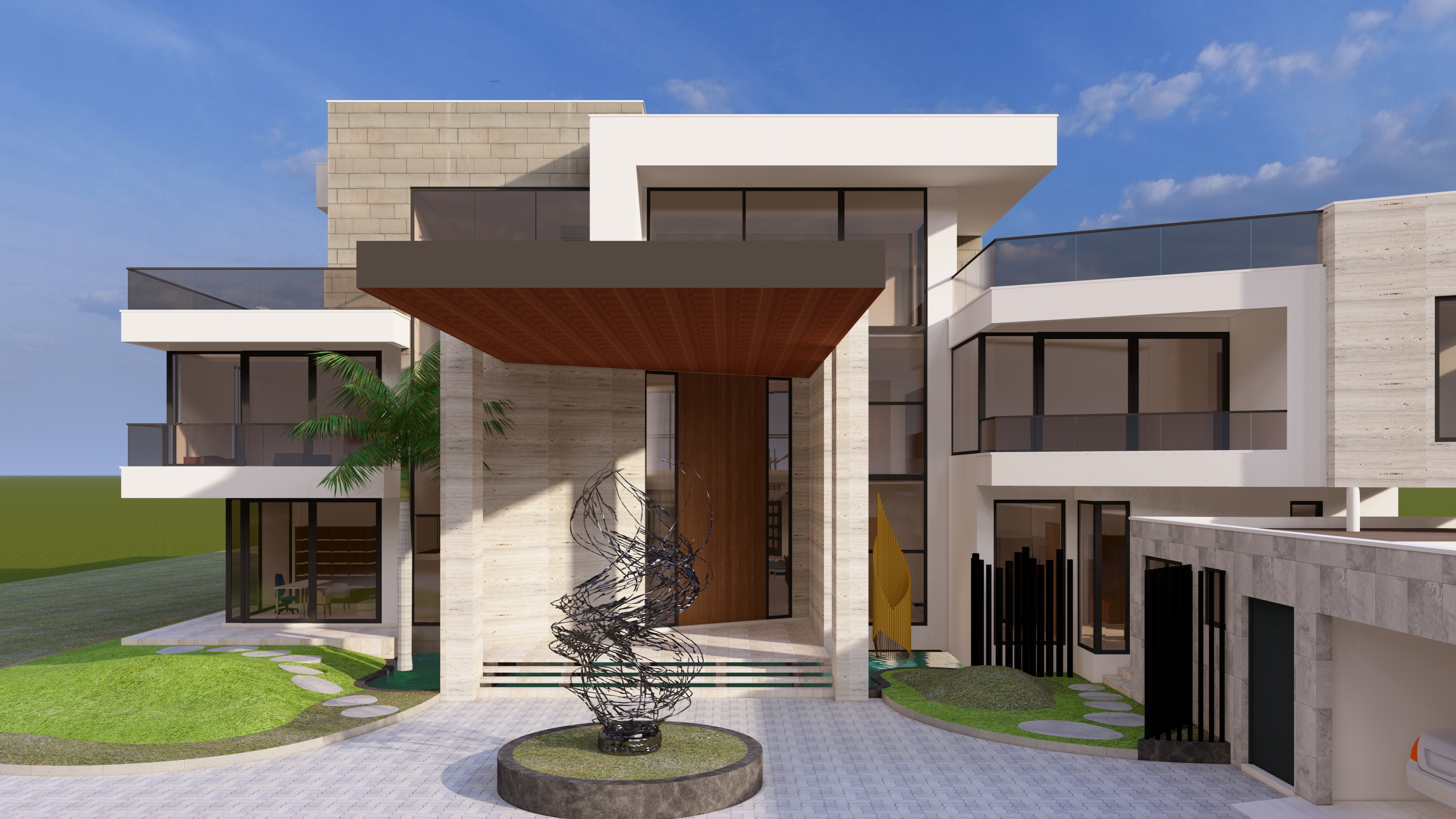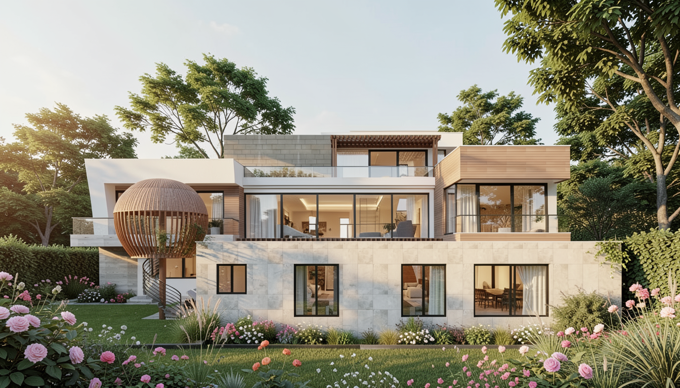 image of modern maisonette add few trees in far background for context add vegetation including floral ones for context as well make scene look lived in there should not be any haziness from the sun light or sun rays