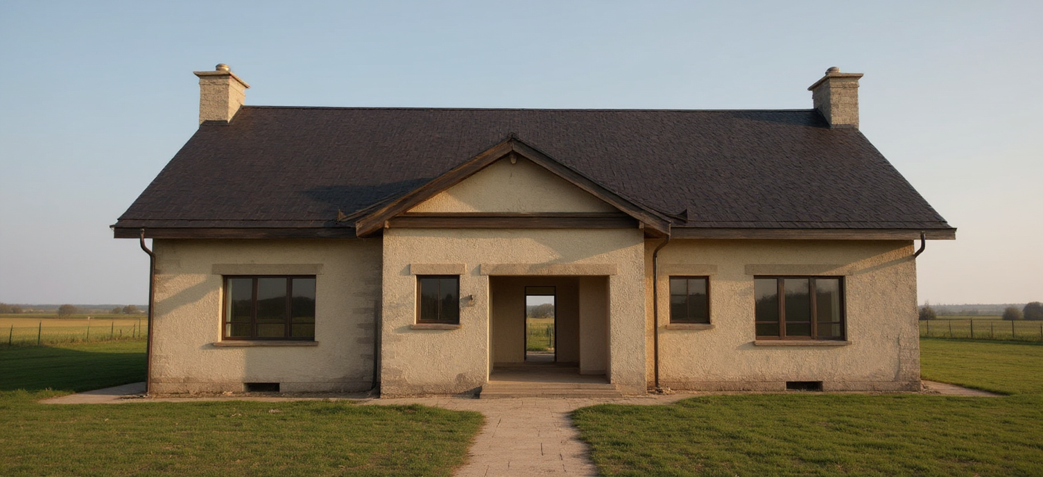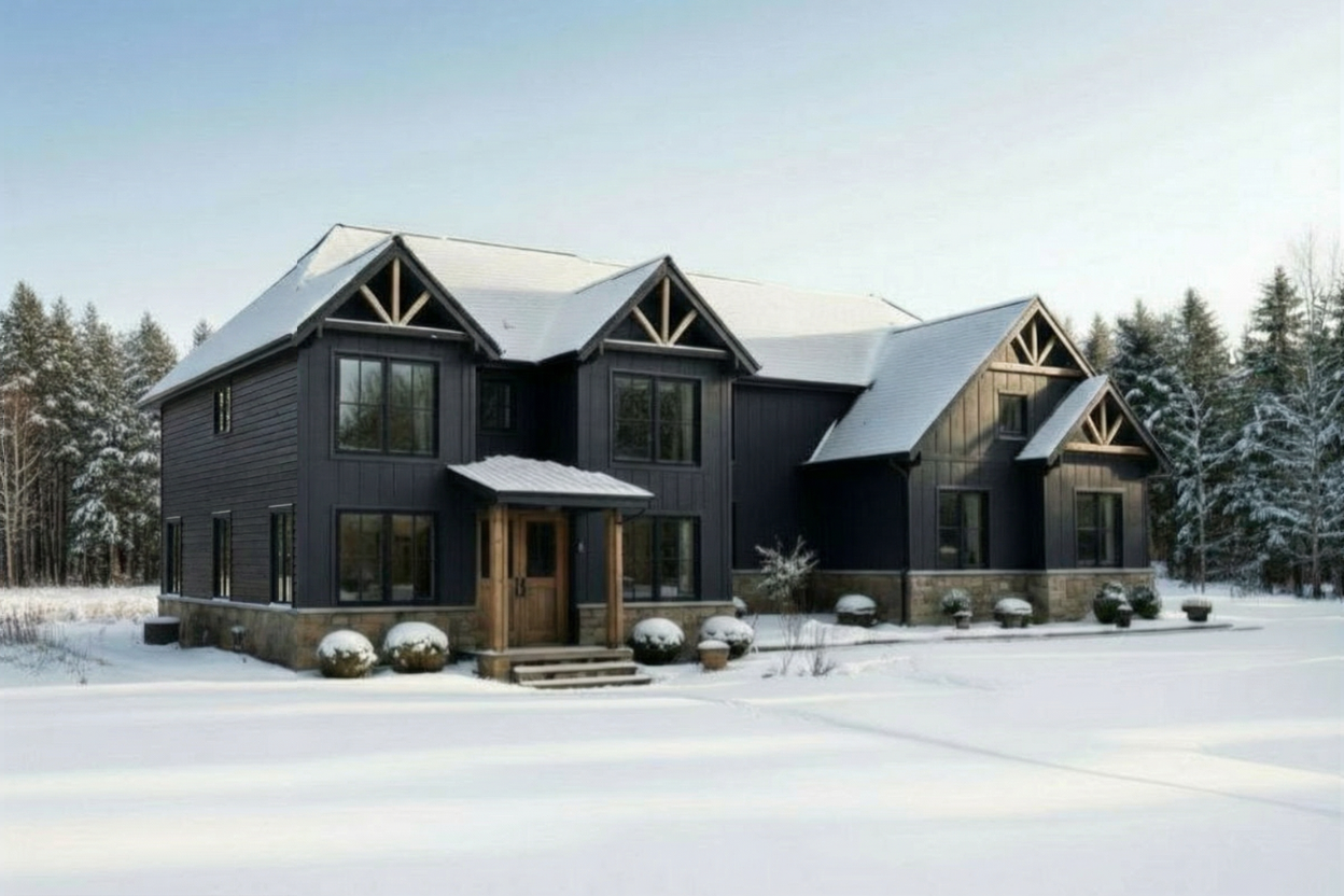 dark blue siding black trim around every window black soffit at roof peaks black gutters have 2 windows on the upper left side