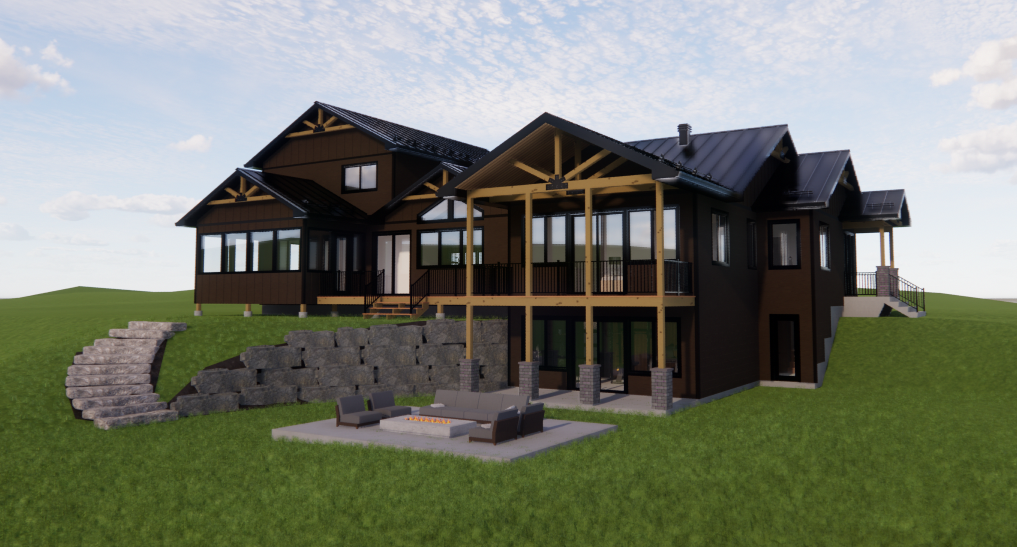 house in a forest in mont tremblant quebec sunny morning close to noon black metal roof black windows black doors wood accent and dark wooden finishes