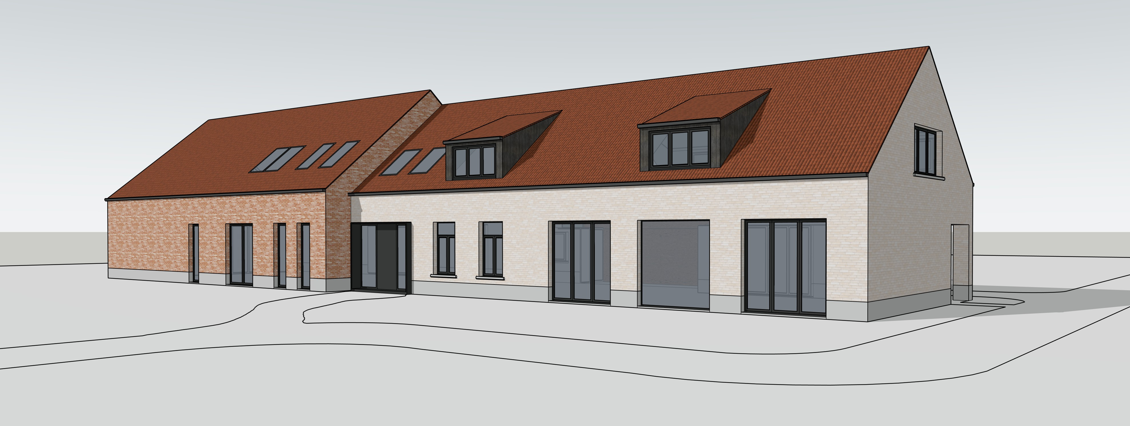 add some small plants and green grass with flowers around the building also some small trees it is a sunny day in the evening