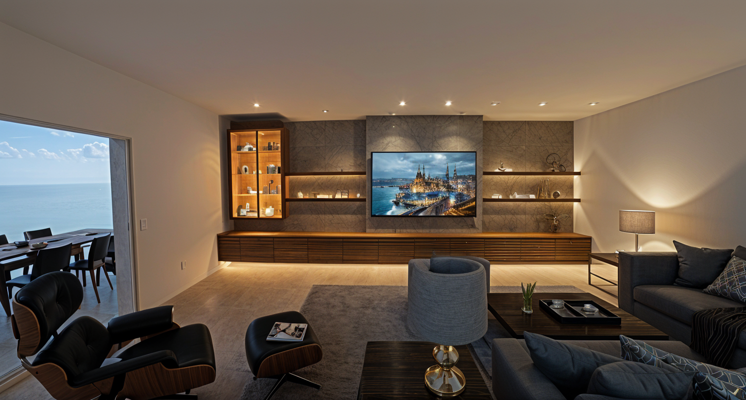 exterior shot tropical shoreline with turquoise shallow water transitioning to deep blue sea small wooden fishing boats and dhows anchored near the beach a working port complex with a fish processing and cold storage facility in the foreground warm toned roofs and light industrial materials long concrete piers and ramps extending into the water people walking along the shore and piers at human scale large warehouse structures set back inland surrounded by palm trees green landscape buffers and sandy beach bright midday sunlight clear sky with soft clouds realistic shadows natural colors calm atmosphere aerial oblique view architectural visualization style realistic materials believable proportions no exaggerated forms lot of people and boats architecture
