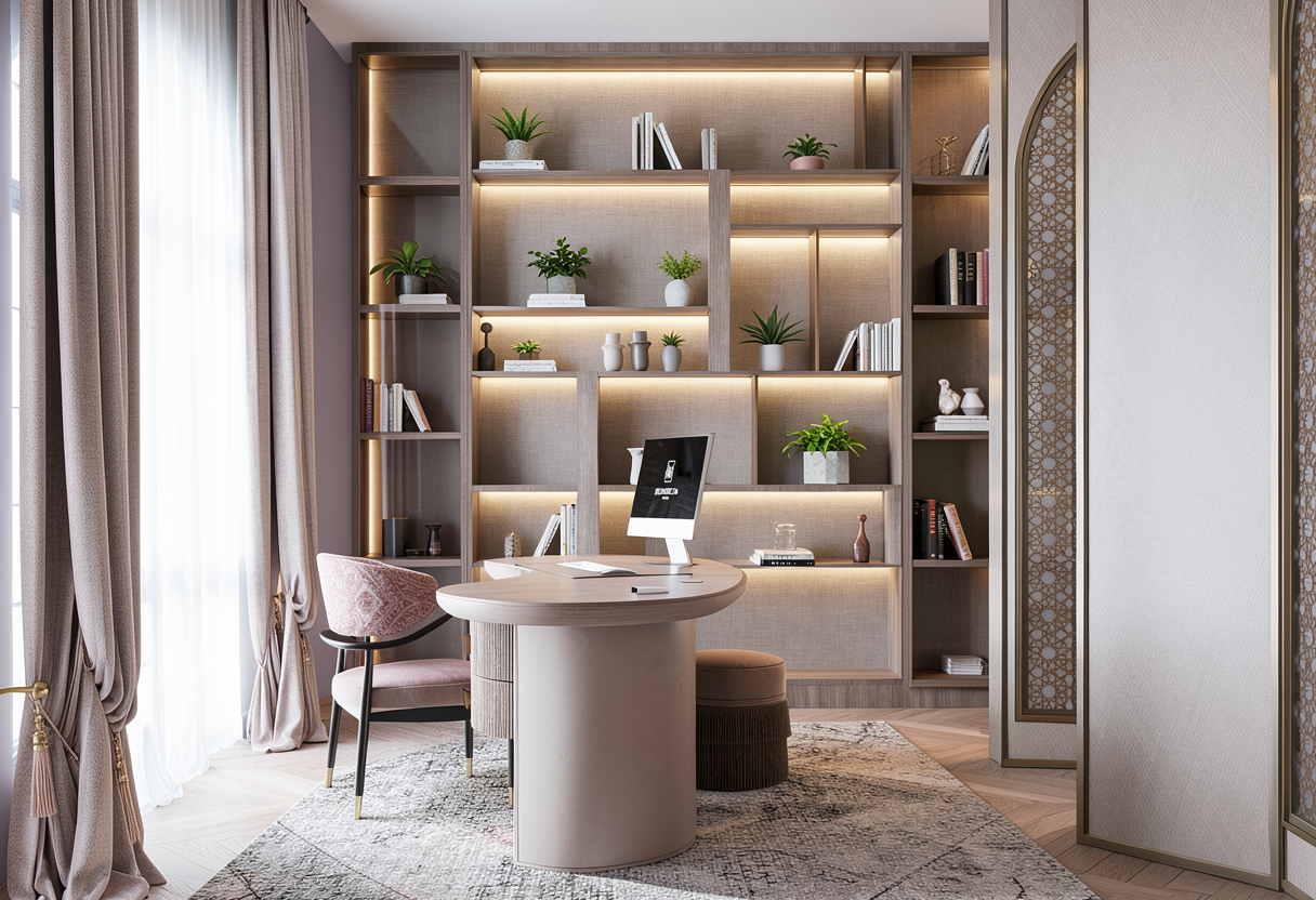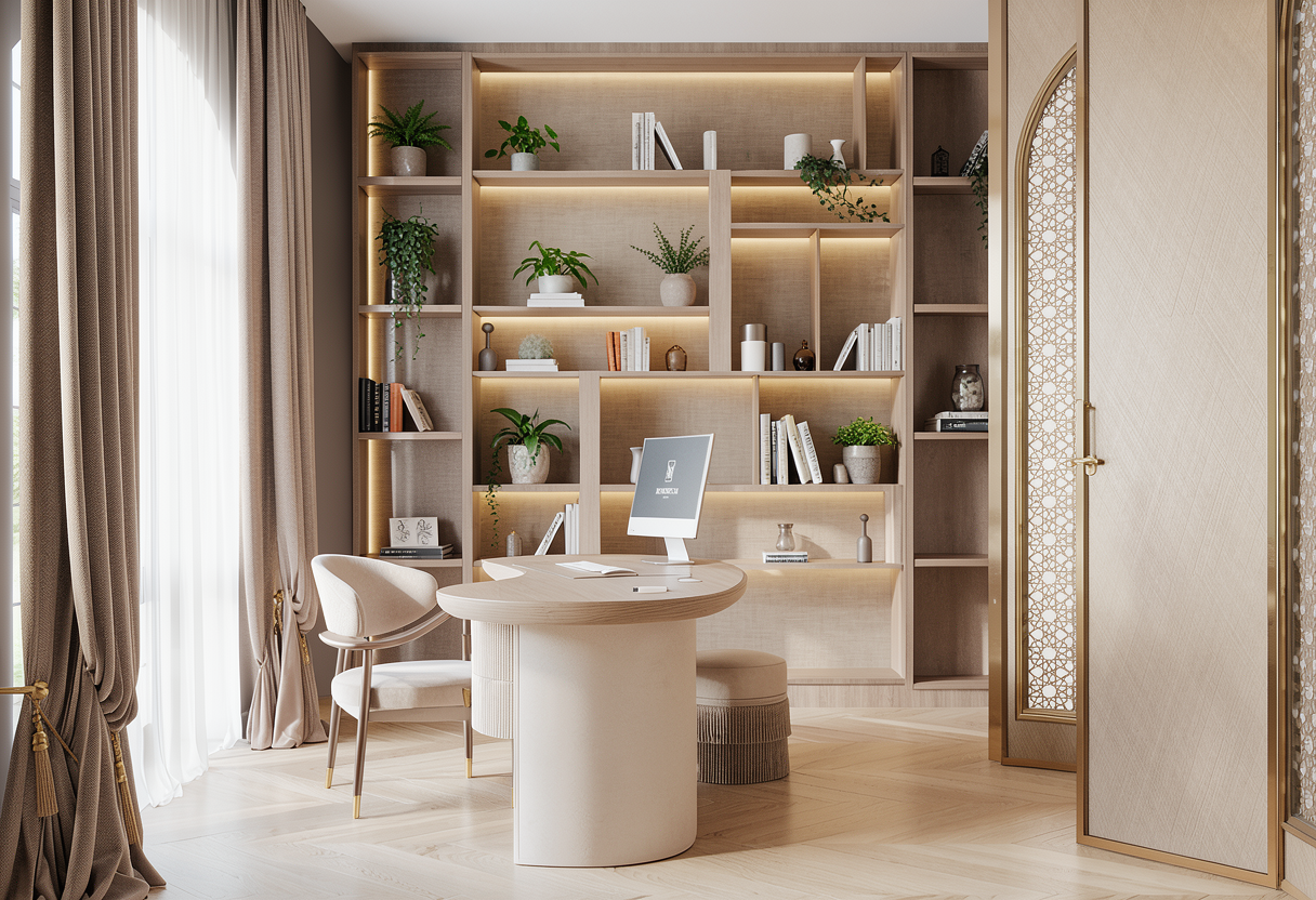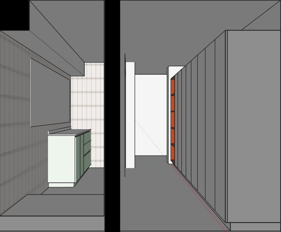 interior rendering instructions general layout the image shows two interior spaces the bathroom on the left and the closet on the right the black lines visible in the image must be kept as they represent a section cut of the floor plan bathroom light colored wooden parquet flooring laid in a 45 degree herringbone pattern matte white ceramic wall tiles 30 10 cm installed vertically white countertop bathroom vanity made of glacier green melamine place a vanity basin on top of the cabinet with a chrome plated steel faucet install a standard wc between the vanity cabinet and the shower area modify the existing shower tray geometry bottom left and replace it with a white shower tray install a sliding glass shower door over the shower tray enclosing the shower area within the bathroom on the left wall above the shower tray install a chrome plated steel shower set including shower bar and shower head place a mirror above the vanity extending over the wc install a continuous led strip light integrated into the beam above the vanity running along the entire length of the bathroom the beam should be white with no tiles applied closet light colored wooden parquet flooring laid in a 45 degree herringbone pattern smooth elegant white walls with a refined finish include a white smooth baseboard guardapolvo for a clean and minimalist appearance built in niches made of golden cypress melamine masisa white doors with a flat finish and no handles style the niches with books framed photos and indoor plants following a scandinavian aesthetic ceiling lighting includes one short linear track fitted with two white spotlights providing soft and focused illumination
