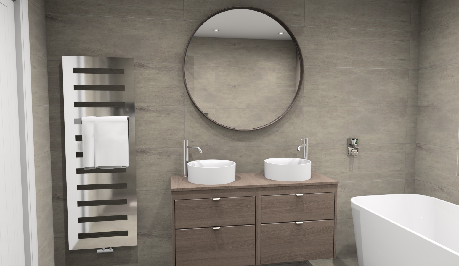 create a realistic modern bathroom interior with a serene atmosphere the room features beige stone walls and floor tiles a sleek white bathtub and a wall mounted toilet the wooden accent wall is a rich taupe color include a window with natural light streaming through wooden blinds add small elegant potted plants on the windowsill the double sinks rest on a light wooden vanity include subtle metallic fixtures and a small shelf within the shower niche holding colorful bottles the mood is tranquil and minimalist with soft lighting enhancing the earthy tones add a soft hue of lighting behind the led mirror