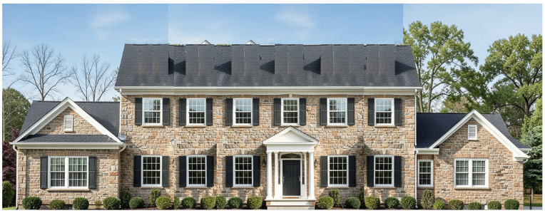 use this image as a style reference only do not copy the house exactly apply this architectural style to the house based on the provided floor plan and massing keep the house layout as main two story center section one story wing on the left that projects forward one story wing on the right the elevation must match the floor plan proportions and window locations match the architectural style of the reference image stone facade on the front black shutters white trim double hung windows with divided grids symmetrical windows on the main two story section center front door with portico and columns simple pediment above the front door traditional colonial style the one story wings should have gable roofs the main section should have a long gable roof with dormers window layout left one story wing 3 windows right one story wing 2 windows main center section symmetrical window layout windows should align vertically between first and second floor make it look realistic