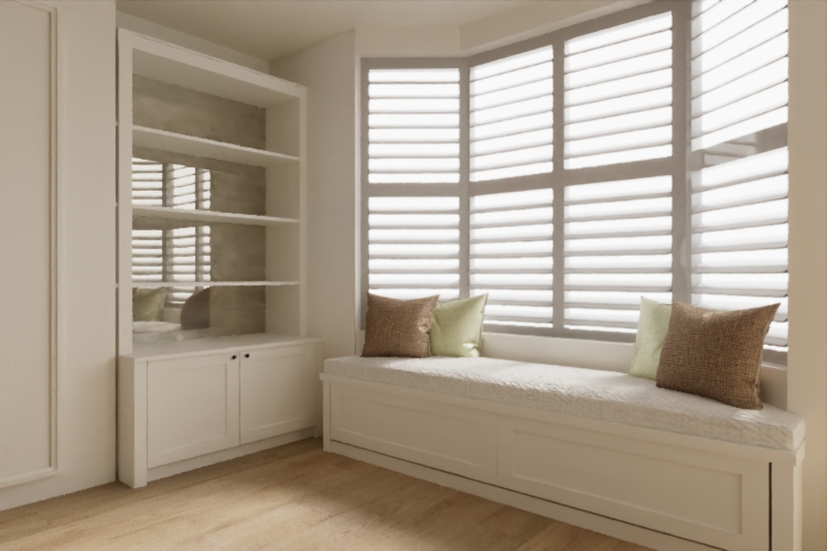 improve the lighting and shutters but keep the shutters white make sure there are leds under the shelves and neutral decor the cushions are white and light grey with fringe or piping the back of the cabinet is antique mirror