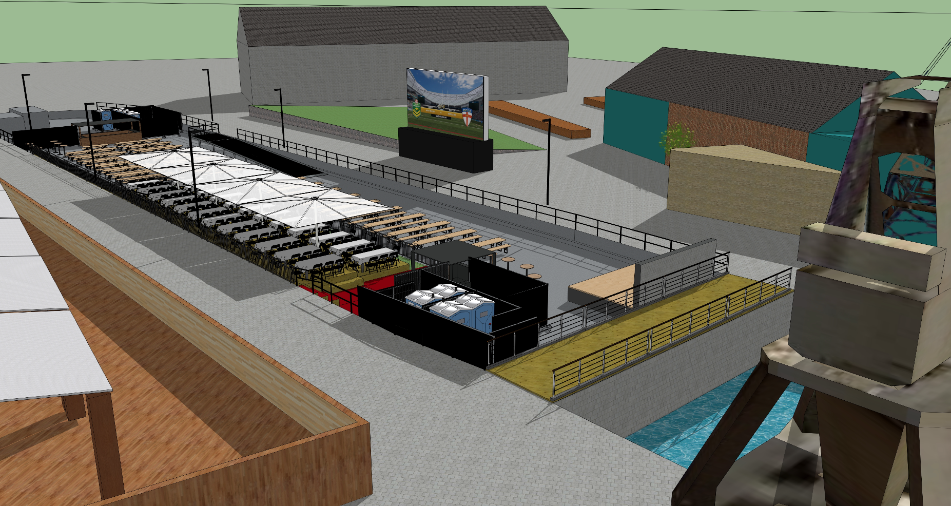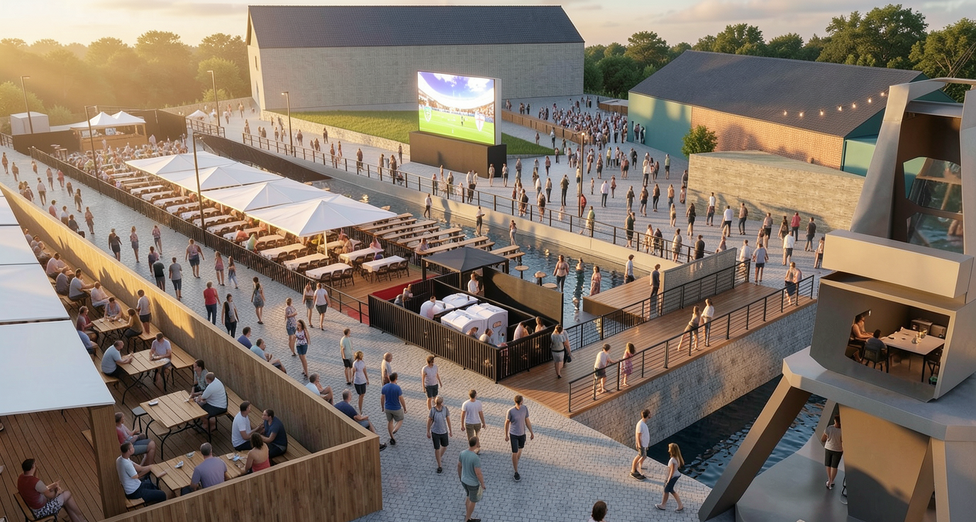 absolute geometry layout lock critical do not change geometry do not move resize rotate or replace any objects do not add or remove structures do not modify any platforms decks edges or surfaces keep exact layout proportions placements and distances maintain original camera angle and perspective ground water rules critical there must be no water inside the dock event area all surfaces inside the dock must be dry solid ground stone concrete wood decking water is allowed only outside the dock basin never on walkways or platforms no reflections or flooded surfaces people placement rules very important add many people to create strong atmosphere people must mainly be seated on benches and standing naturally along walkways no people on top of the white toilet containers no people inside or on the toilet area no people inside or on the crane no people in backstage technical zones people must gather naturally facing the big screen terrace railing lock the left wooden terrace must have black iron railing same style and height as the dock railings railing must be natural human height not tall fencing not crowd barrier height outdoor restaurant furniture on the terrace tables chairs lounge seating background context critical the far background must be urban city environment no forest no trees no countryside no park landscape modern scandinavian harbor district architecture material locks pedestrian bridge must be natural wooden decking no grass no green decking no landscape surfaces scene goal create a packed vibrant football fan zone with strong social energy excitement and shared emotional experience of a world cup match in a modern urban harbor setting atmosphere mood high energy warm social joyful strong sense of community scandinavian summer evening vibe lighting golden hour early evening warm ambient lighting led screen glow illuminating people natural reflections only from actual water basin render style ultra realistic premium architectural visualization cinematic but natural professional event rendering sharp focus realistic shadows realistic reflections no stylization no fantasy look negative prompt lim inn sv rt viktig water inside dock flooded ground wet walkways reflections on plaza people on toilet containers people inside toilets people inside crane people on crane structure people in backstage forest background trees countryside grass surfaces green decking tall fences crowd barriers new platforms new surfaces geometry changes redesign fantasy lighting