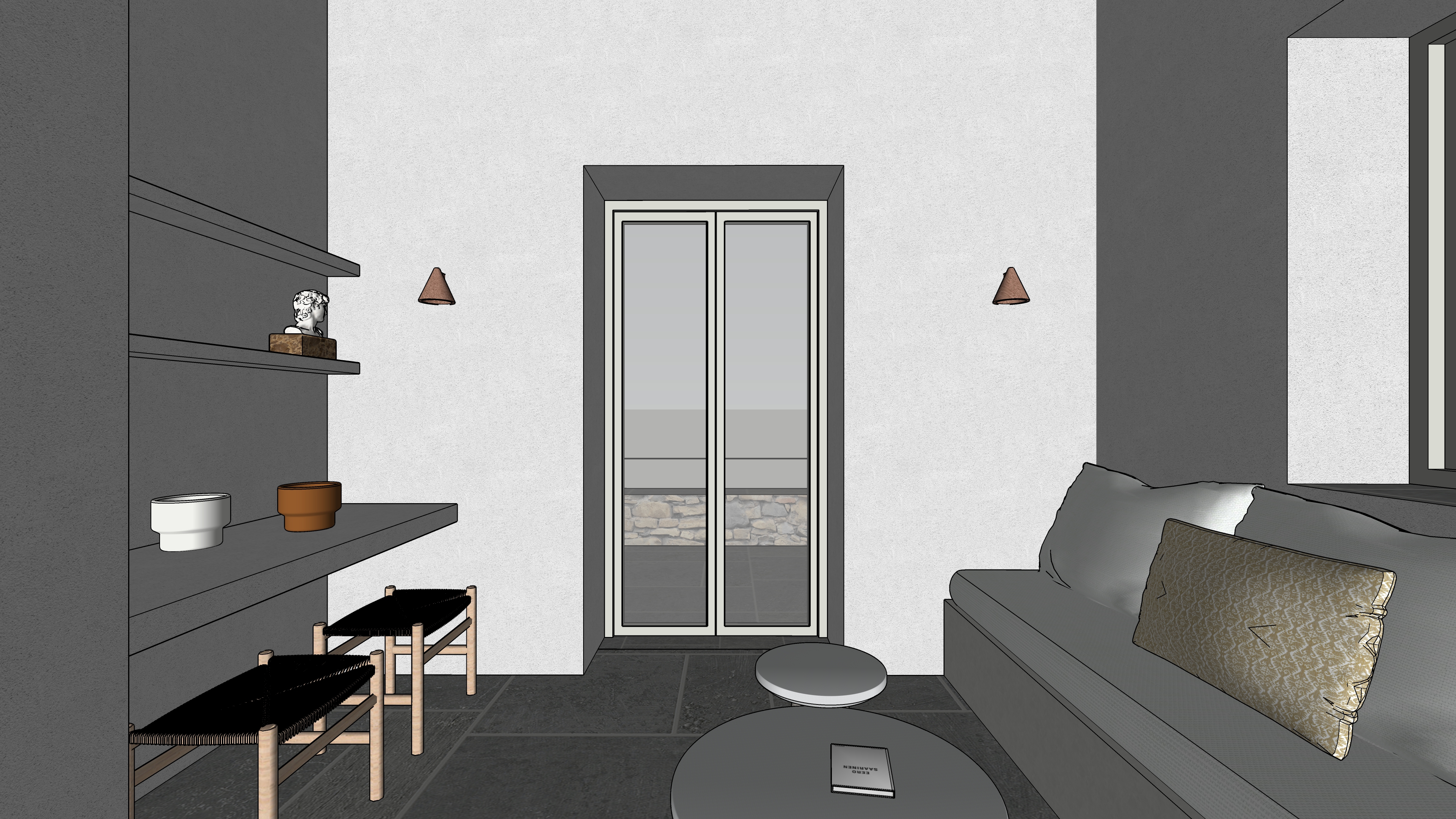 main prompt this is a cycladic house in kythnos the floor is natural gray pelion stone the sofa is white cement paint the sofa fabrics are light cream the window frames are sage green the walls are white there is natural light the sconces are terracotta ceramic negative prompt do not change geometry do not add objects do no change colors or materials