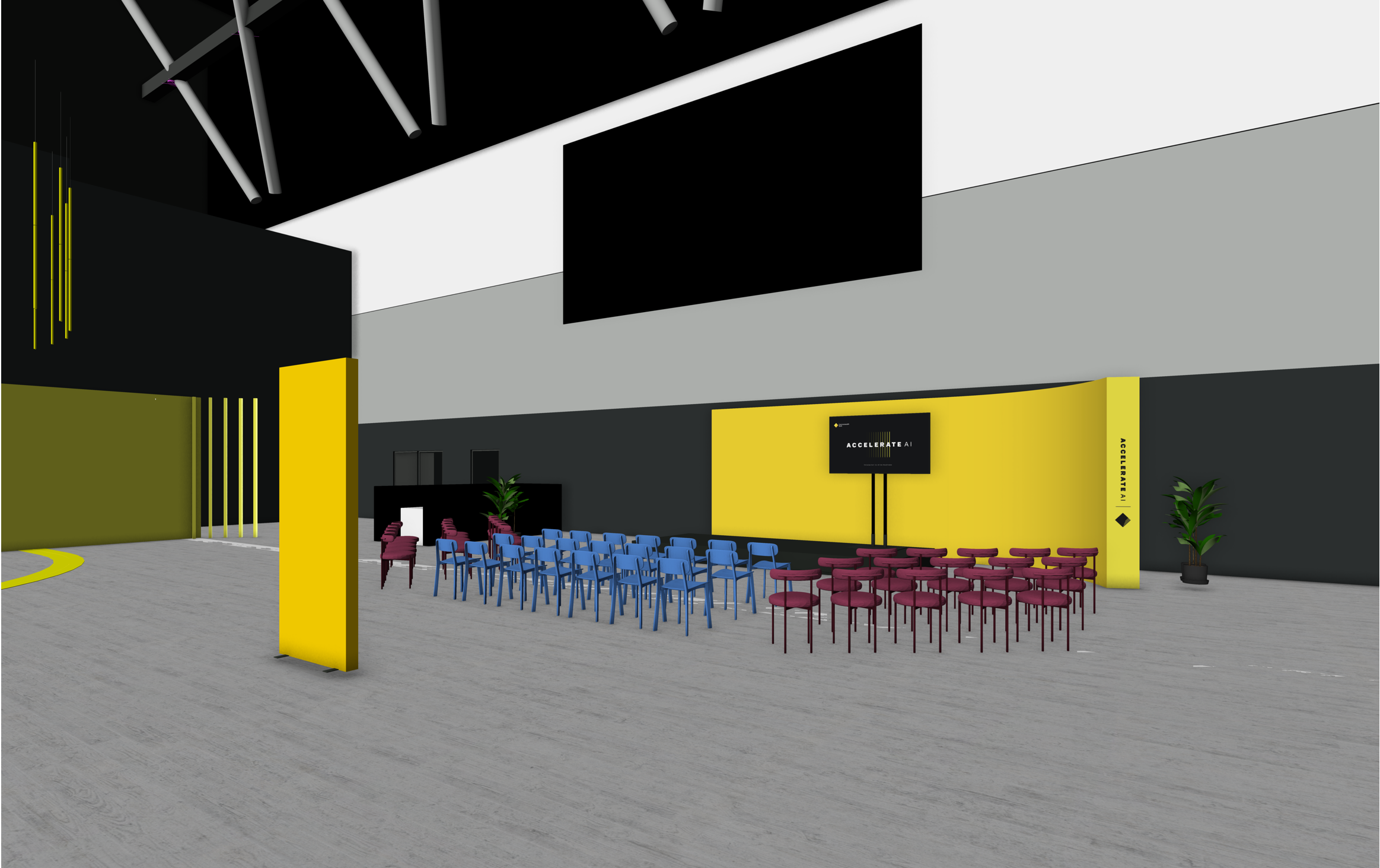 a modern exhibition hall with soft dark lighting featuring a ceiling illuminated by glowing yellow neon lights smooth dark grey concrete replace yellow rectangle near the front with soft glowing light box have a person looking at the box woman business female presenter on stage with microphone audiences with glowing blue headphones blurred business woman and men with yellow lanyard passing by